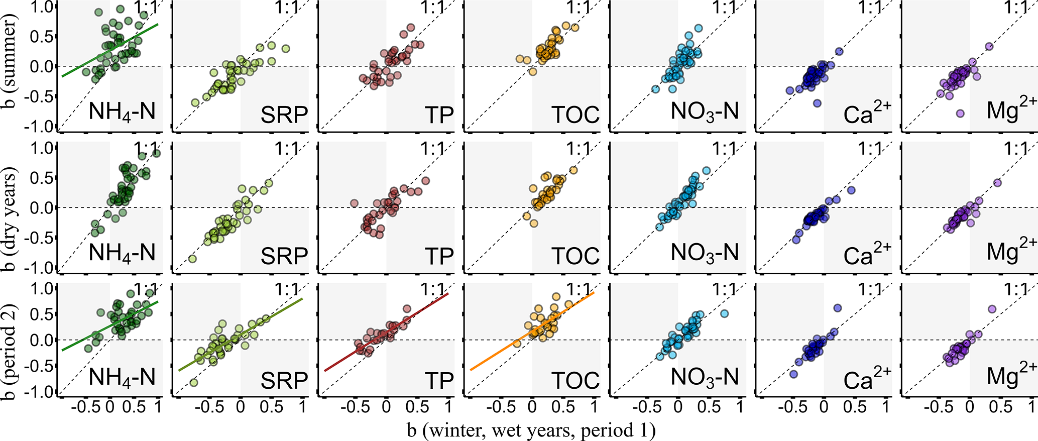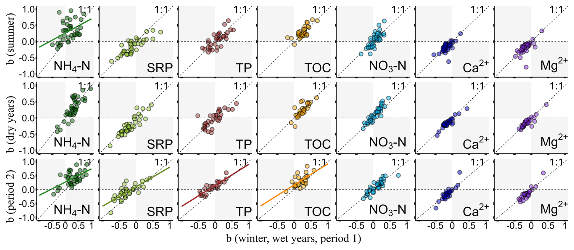 Figure 4Differences in solute export mechanisms for NO3-N, NH4-N, SRP, TP, TOC, Ca2+, and Mg2+ in response to temporal changes. Differences in solute export mechanisms between (top) summer and winter, (middle) between dry years and wet years and (bottom) between climatically different period 2 and period 1. Dots represent individual catchments. The b values (y axis and x axis) are slopes derived from c–Q-relationships, indicating export behavior (b<0: dilution; b>0: enrichment). Points above the 1:1 line indicate an increase in enrichment or a decrease in dilution behaviour, whereas points below the 1:1 line indicate a less pronounced enrichment or an increased dilution export pattern respectively. The gray areas indicate a directional shift in solute export.