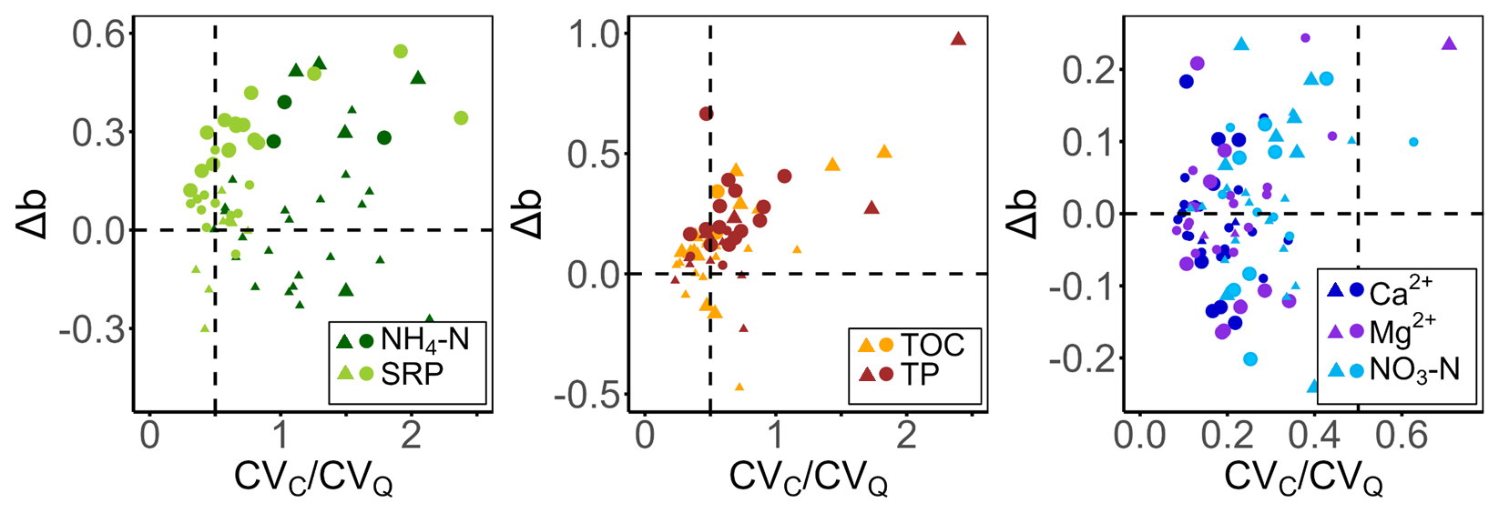 Temporal analyses revealed significant changes in SEM across seasons (NH4-N and SRP) and across decades (NH4-N, SRP, TP, and TOC). NH4-N exhibited the strongest seasonal variability, with pronounced enrichment pattern in summer and reduced enrichment dynamics in winter. SRP typically tend towards non-significant dilution behaviour during summer and enrichment behaviour in winter, highlighting its temporal variability (Fig. 4). Over the recent decade, however, dilution processes weakened for SRP, as indicated by a positive Δb, particularly in catchments that had displayed dilution SEM in earlier decades (Fig. 5). For both NH4-N and SRP, variability in Δb increased with higher CVC CVQ ratios.