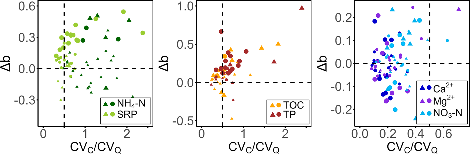 Figure 5Change in c–Q-relationships (Δb) for SRP, NH4-N, TP, TOC, NO3-N, Mg2+, and Ca2+ explained by changing climatic conditions. Positive Δb values indicate an increasing enrichment behaviour. ▴ represent catchments exhibiting enrichment behaviour in period 1, while • indicate catchments with dilution behaviour in period 1. Significant differences in slope b between period 1 and period 2 are highlighted by larger symbol sizes.