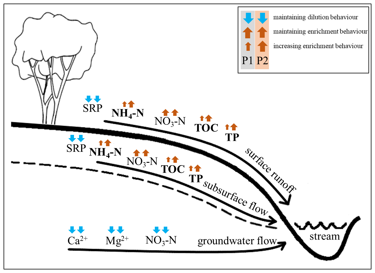In contrast, long-term dynamic solutes such as TP and TOC are less affected by temporal changes, showing no clear seasonal patterns but rather interannual variations in response to climatically different periods. Nutrients are transported via surface runoff and subsurface flow. The gradual climatic change from period 1 to period 2 may serve as a good proxy for how future climatic changes could increasingly alter both transport pathways, leading to shifts in SEM. So, since 2012 (period 2), warmer temperatures, prolonged heatwaves, and sporadic but intense precipitation events have led to increased internal source accumulation and reduced hydrological connectivity. As a result, solute mobilization and transport are largely confined to near-surface pathways during shortened wet periods in summer and to rising water levels in winter, leading to intensified enrichment behaviour. Furthermore, enrichment processes have increasingly outweighed dilution mechanisms, particularly in the case of SRP.