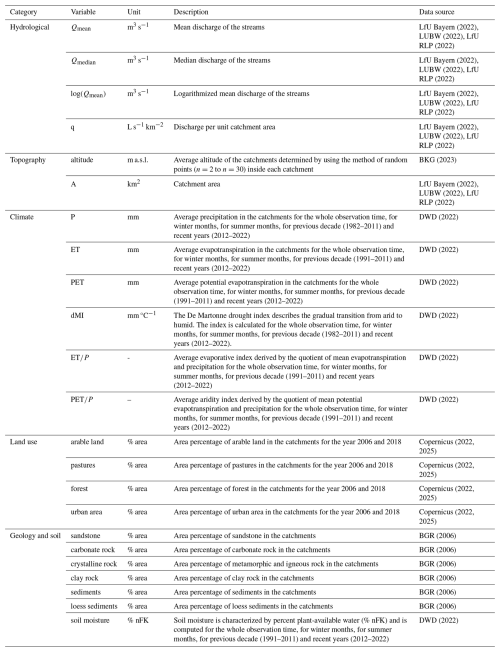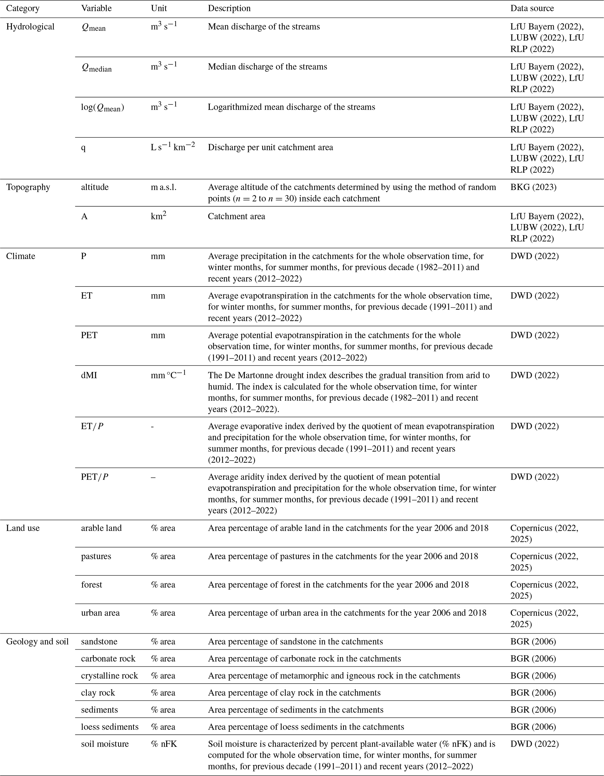 Catchment characteristics were grouped into several categories and compiled from institutional datasets (Table 1). Hydrological indices included mean discharge Qmean and median discharge Qmedian, the logarithm of mean discharge log(Qmean), and specific discharge (q; Eq. 4). Specific discharge q is the quotient of discharge Q and the catchment area A, whereby discharge in m3 s−1 was converted into discharge in L s−1.
