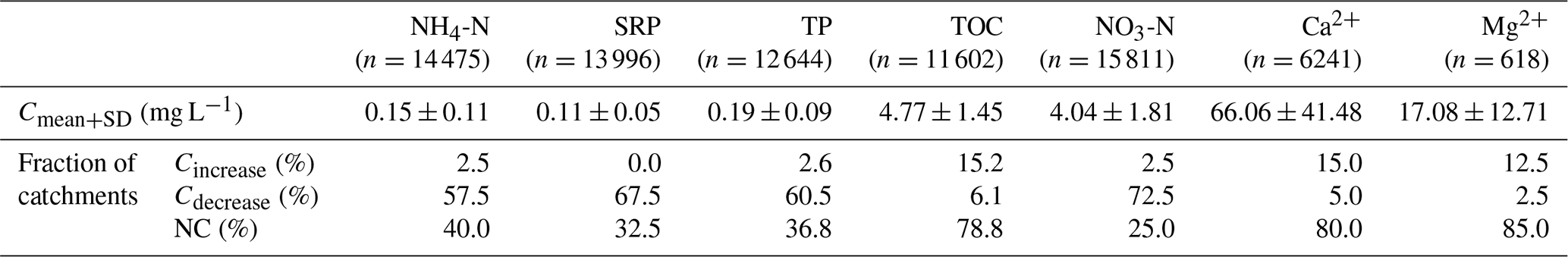 Table 2Descriptive statistics of mean solute concentrations (Cmean, mg L−1) and associated standard deviations (Cmean±SD) across all catchments. Interannual Trends in interannual solute concentrations are summarized as fraction of catchments (%) showing positive trends (Cincrease), negative trends (Cdecrease), or no significant trends (NC – no change). Trends were assessed using linear regression models (concentration vs. time), with p values derived from F tests and adjusted for multiple comparisons within each catchment dataset using the Benjamini–Hochberg procedure (p<0.05). The number of catchments included in the analysis is denoted by n.
