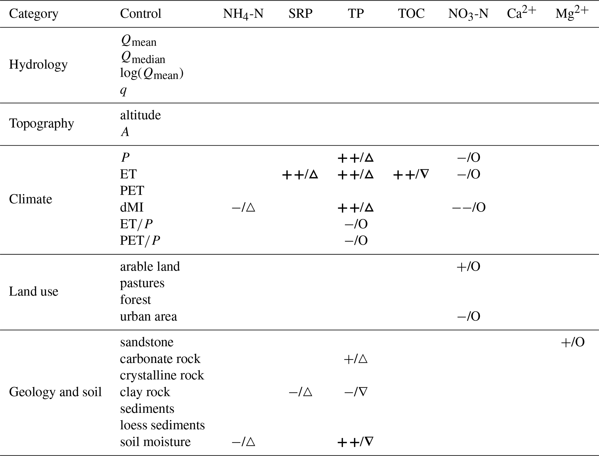 SEM of nutrients are influenced by distinct explanatory controls. The impact of these controls is potentially influenced by changing climatic conditions. Pearson correlation coefficients (ranging from 0.33 to 0.75, p<0.05 corrected by Benjamini-Hochberg procedure) were used to assess relationships between SEM (slope b) and explanatory controls for the decade before and after 1 January 2012. In addition, statistical differences between correlations for period 1 and period 2 were formally evaluated using analysis of covariance (ANCOVA). The obtained Pearson correlation coefficients indicate both positive and negative correlations (Table 3).Shallow-sourced nutrients are primarily influenced by near-surface environmental conditions, particularly climate (e.g. temperature and precipitation), as well as soil moisture and the decomposition of organic material on the ground and in the upper soil layers. In contrast, geogenic solutes such as Ca2+ and Mg2+ are predominantly controlled by geological weathering processes. In addition to climatic influences, land cover, soil moisture conditions and geological characteristics affect shallow-sourced solutes.