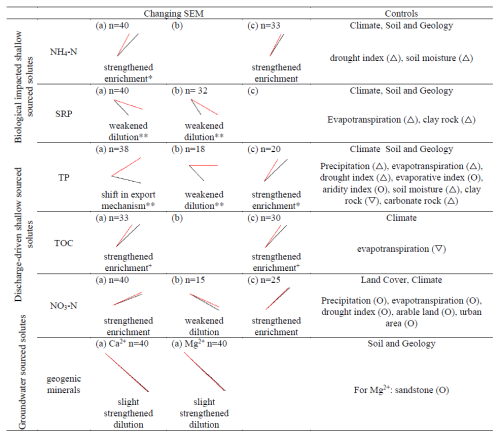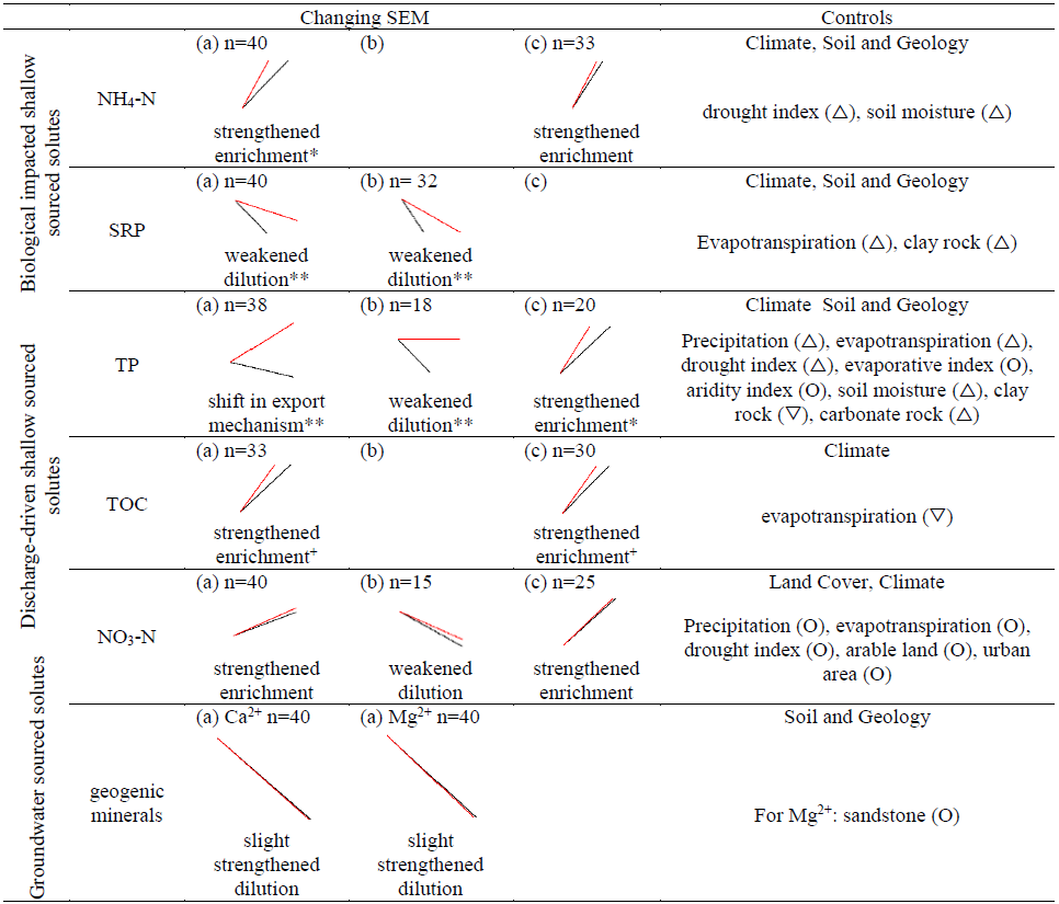 Table 4Changing SEM across period 1 (black) and period 2 (red) for SRP, NH4-N, TP, TPC, NO3-N, Ca2+, and Mg2+, along with their controlling factors. Significant differences were tested using the Kruskal-Wallis test corrected with Bonferroni correction (+ <0.1, * <0.05, ** <0.01). Symbols indicate increasing (△),decreasing (∇) or unchanged (O) control impact. Panels: (a) all catchments, (b) catchments with dilution behaviour in period 1 (n≥10), (c) catchments with enrichment behaviour in period 1 (n≥10). Trends are based on mean calculations.