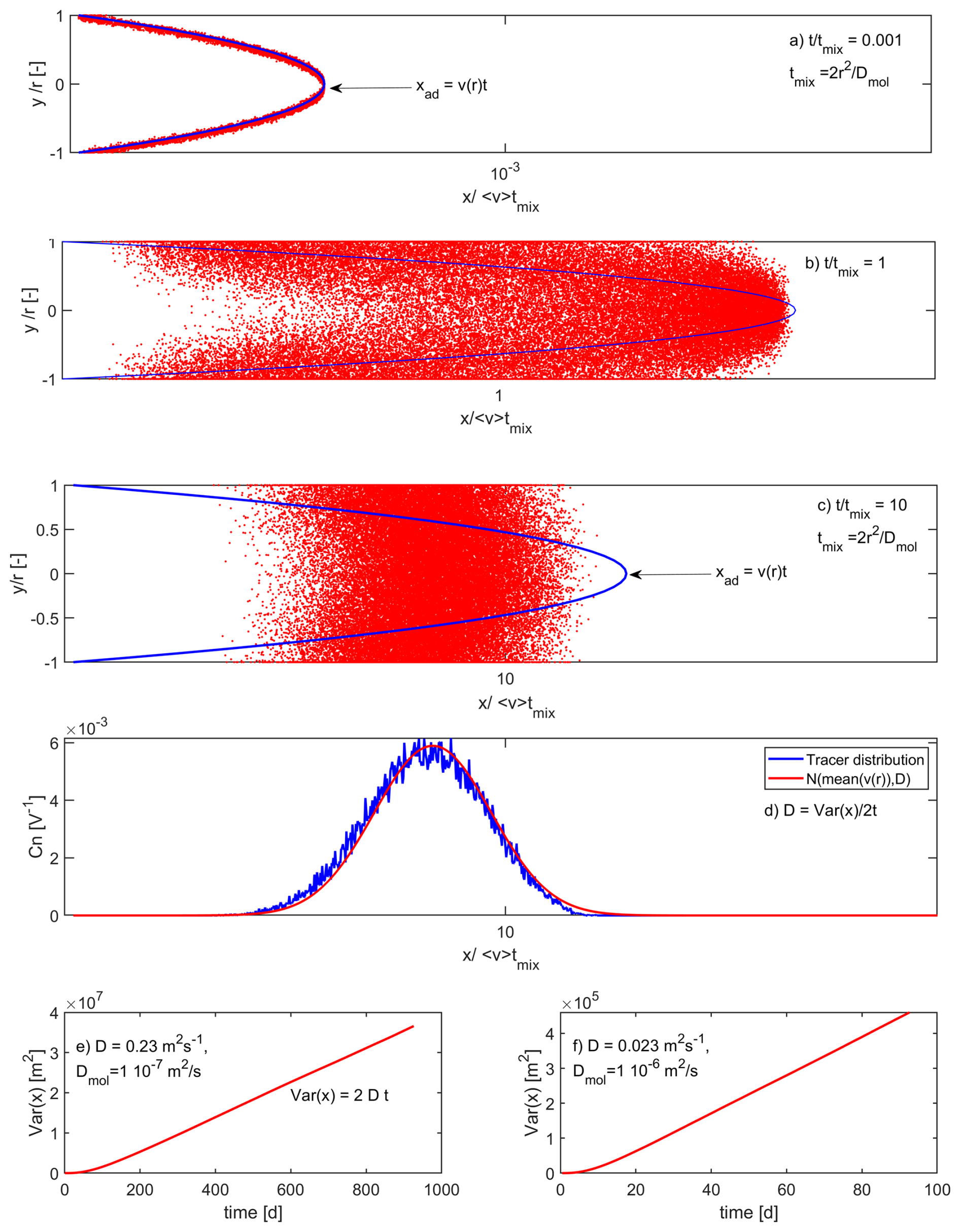 Figure 1The three stages of Taylor-Aris dispersion in a capillary tube pore with radius r (m) as a function of the diffusive mixing time scale : (a) near field for t≪tmix, intermediate state for t=tmix (b) and well mixed far field for t≫tmix (c). Variance of particle transport distances as a function of time for m2 s−1 (e) and m2 s−1 (f). All graphs were inferred from transport simulations based on particle tracking.