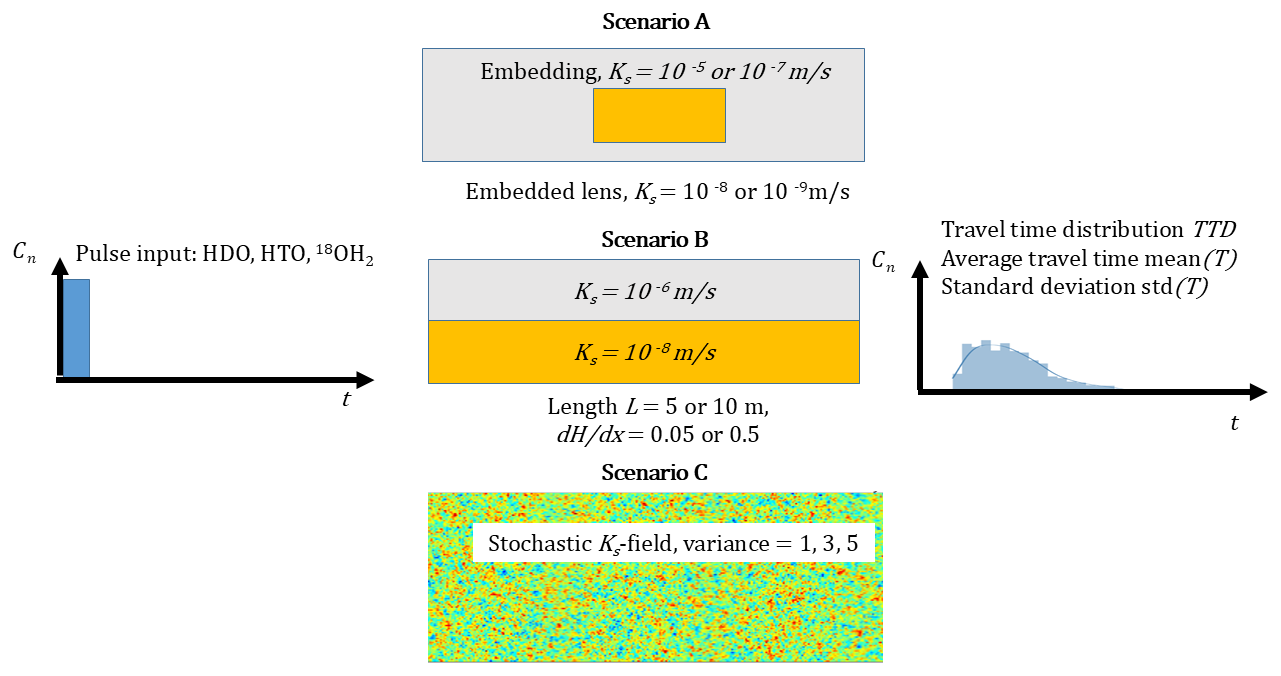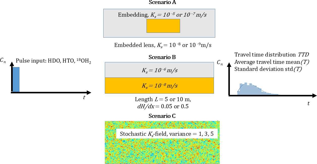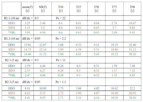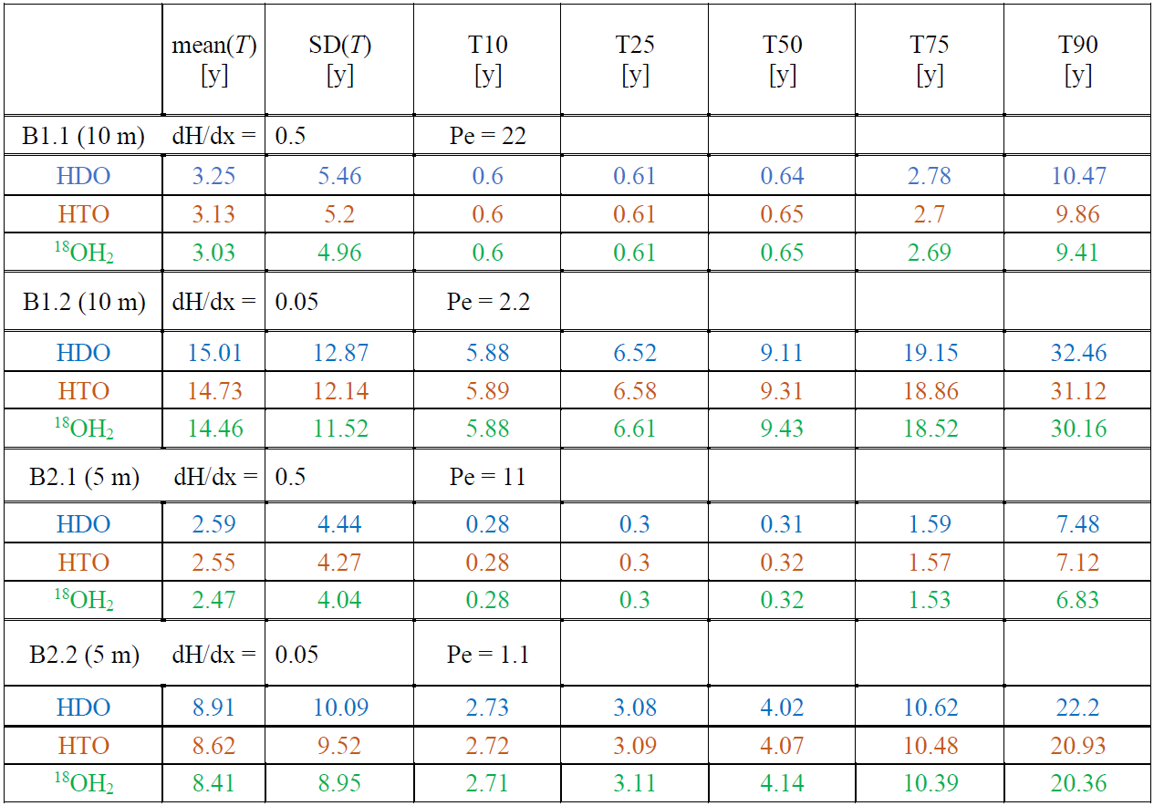 To shed light on the role of the different diffusion coefficients of deuterium, tritium and O18 for the transit time distributions, we simulated advective-diffusive transport through steady-state flow fields in two dimensional saturated domains of increasing heterogeneity, comparing the transport of the three different water isotopes. Their respective diffusion coefficients in water at a temperature of 25 °C are, according to Devel (1962) and Wang et al. (1952), m2 s−1, m2 s−1 and m2 s−1. For the case of HTO we chose to ignore its radioactive decay, to assure that optional differences in average travel times stem only from the differences in diffusion coefficients.