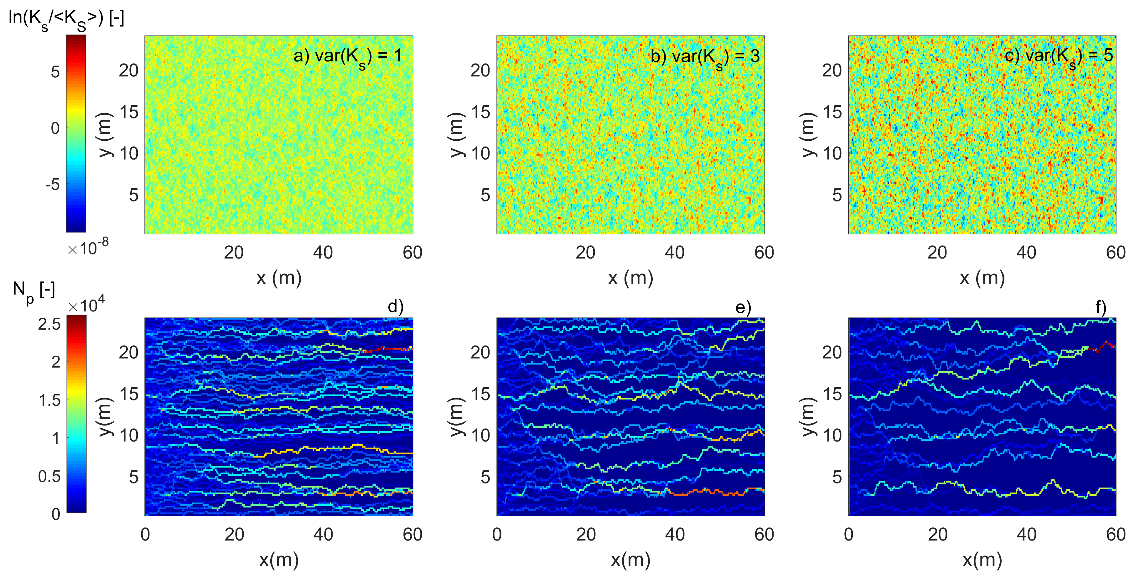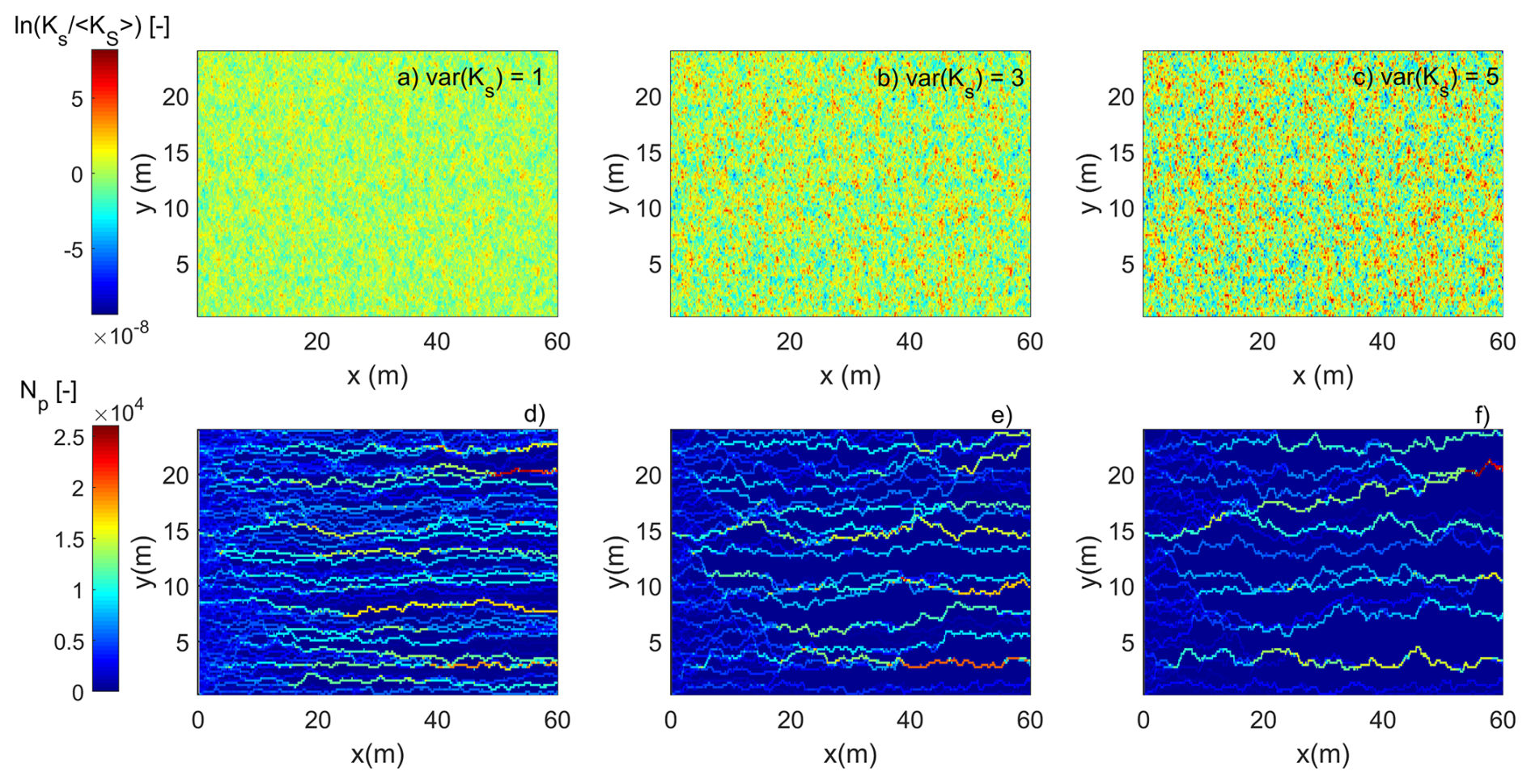Figure 3The normalized hydraulic conductivity fields for three randomly selected realizations of small, medium and large variance (a, b, c). Normalized cumulative number of particles (Np) that visited a grid cell in the simulation domain for small, medium and large variance (d, e, f) for HDO inferred from a critical flow path analysis. Funneling of water and HDO into preferred pathways become clearer stronger with increasing variance of the hydraulic conductivity field.