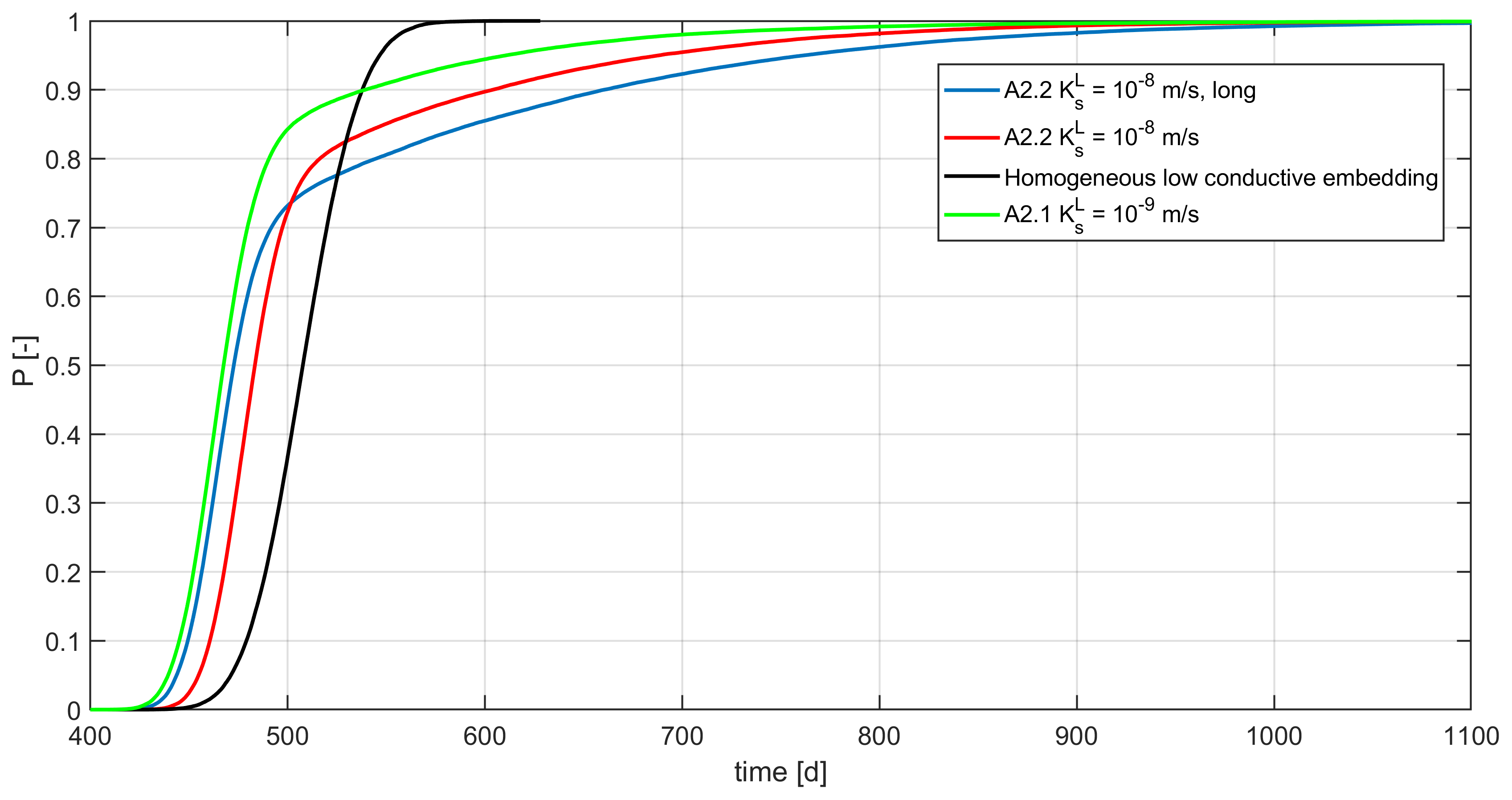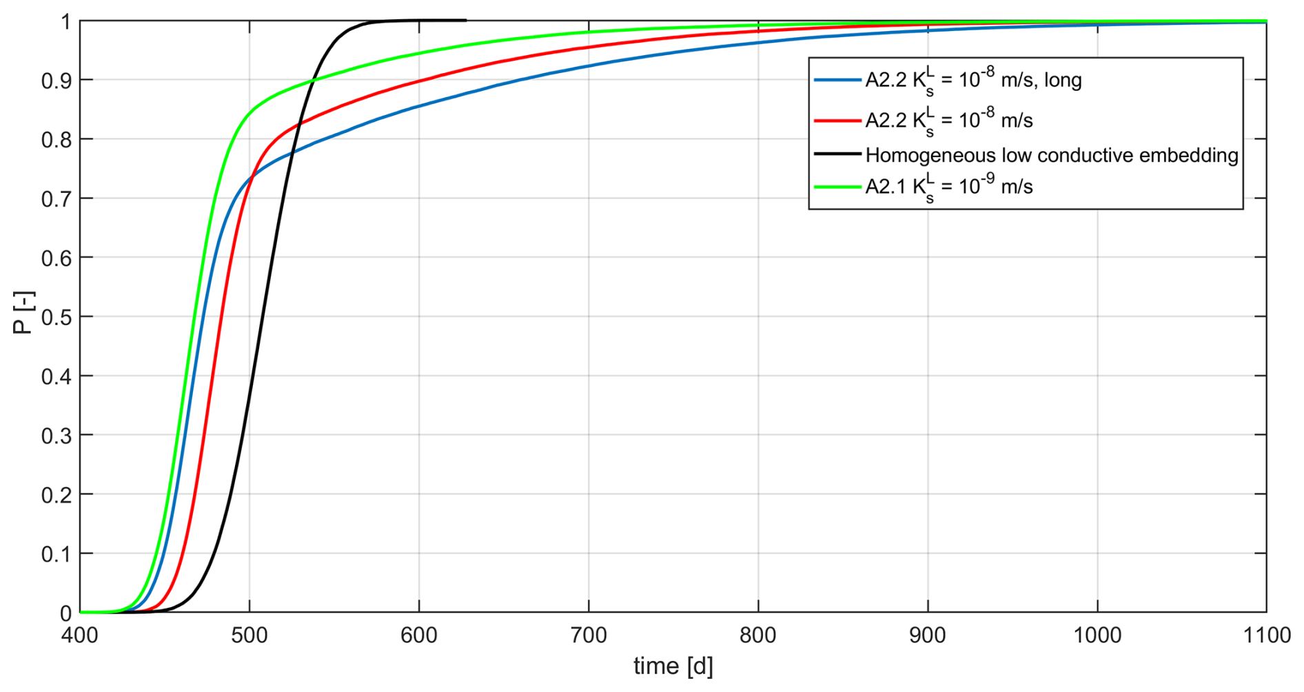 Figure 4Cumulative breakthrough curves/travel time distributions of HDO for scenario A.2.1 and A. 2.2, i.e., the low conductive embedding medium with m s−1, using the travel time distribution through the homogeneous medium as reference.