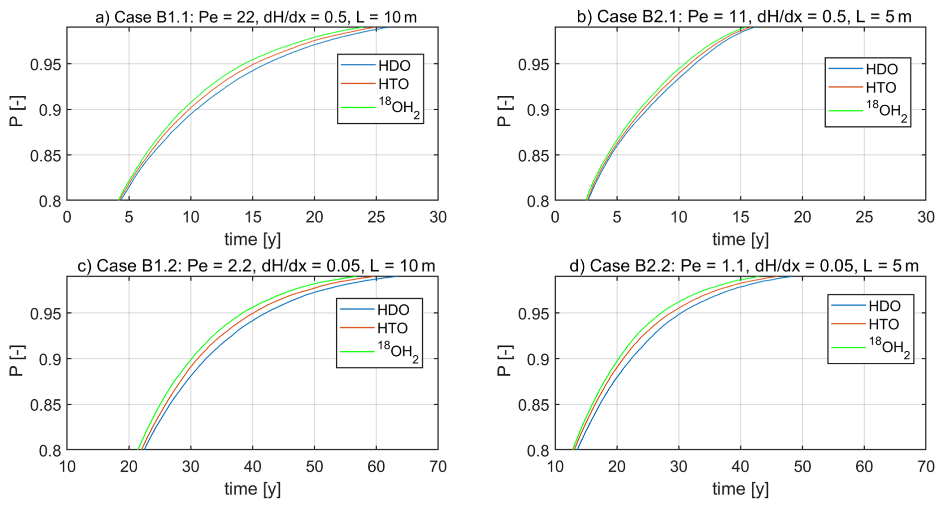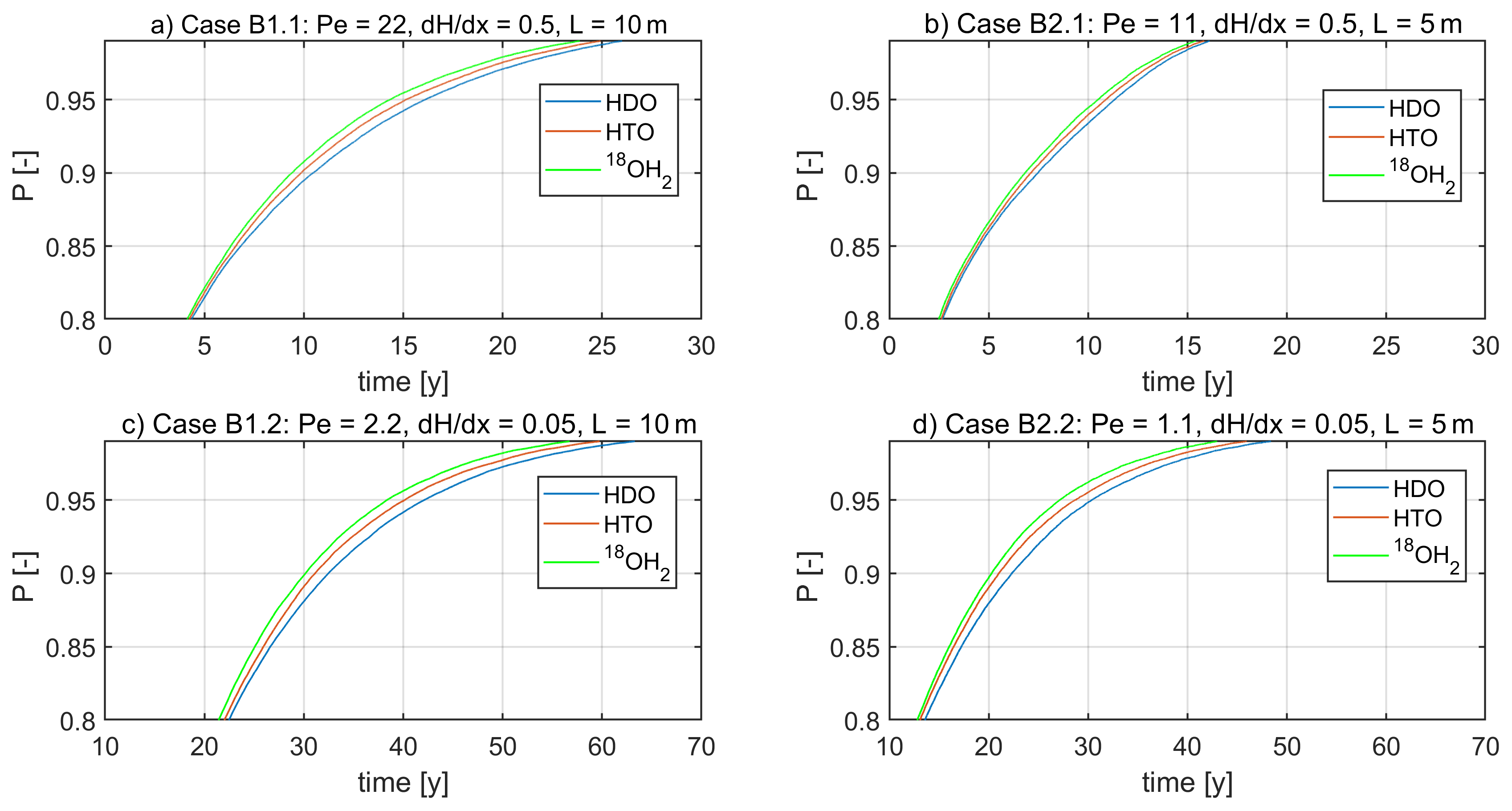 Figure 5 provides the cumulative breakthrough curves/travel time distributions (TTD) through the two layered system of 10 m (B1) and 5 m length (B2) at the two different head gradients. In all cases we found a distinct dependence of the TTD on the diffusion coefficient of the different isotopes. Generally, HDO exhibits in all cases the largest mean travel time followed by HTO followed by 18OH2 (Table 2). A slower diffusion implies indeed a shift towards longer travel times, which manifest particularly in the long tails and the larger quantiles (Table 2). To highlight these differences, Fig. 5 zooms to travel times larger than the 80 % quantiles and smaller than 99 % quantiles. We found however also that the standard deviation and thus the dispersion of travel times grows systematically with declining diffusion coefficient.