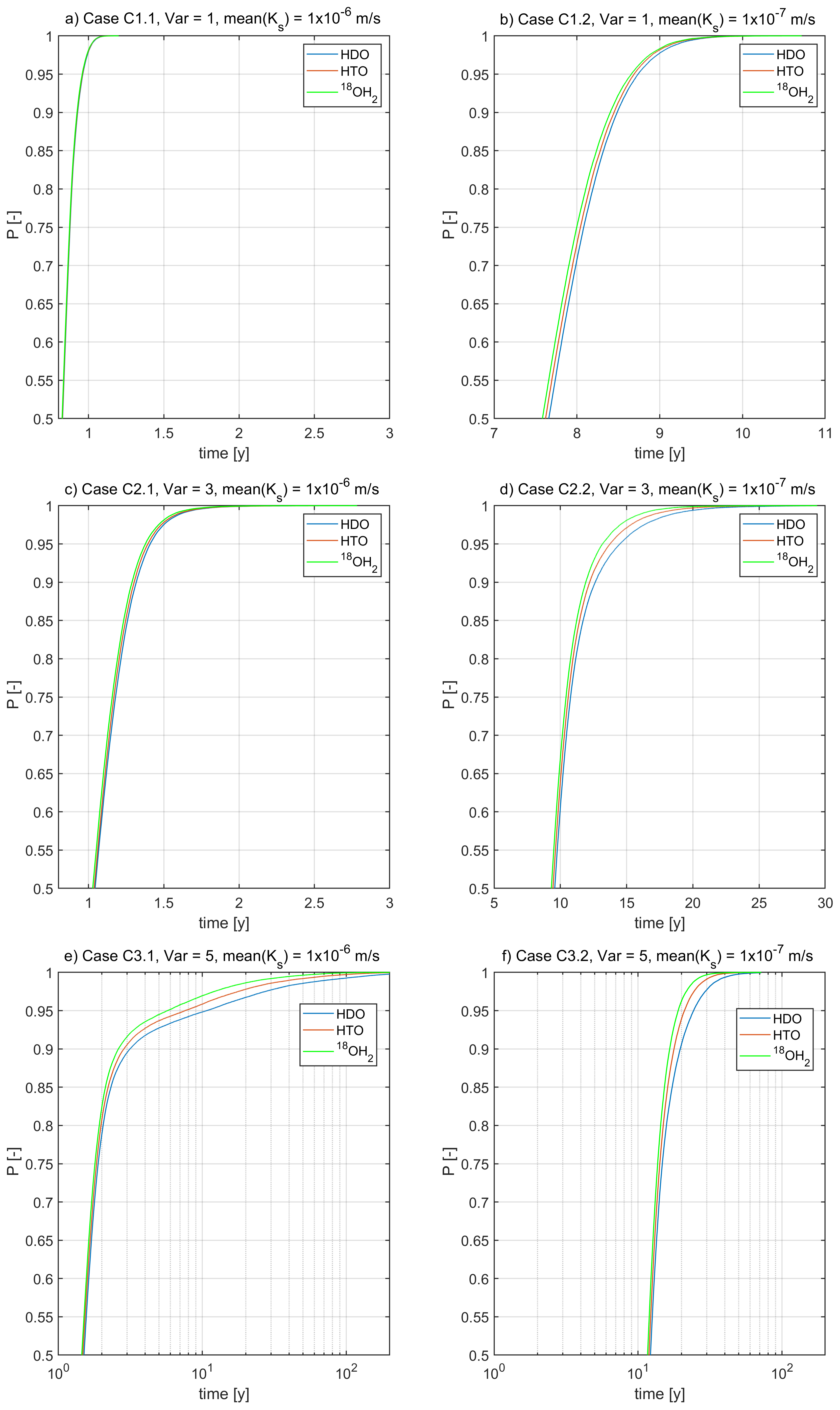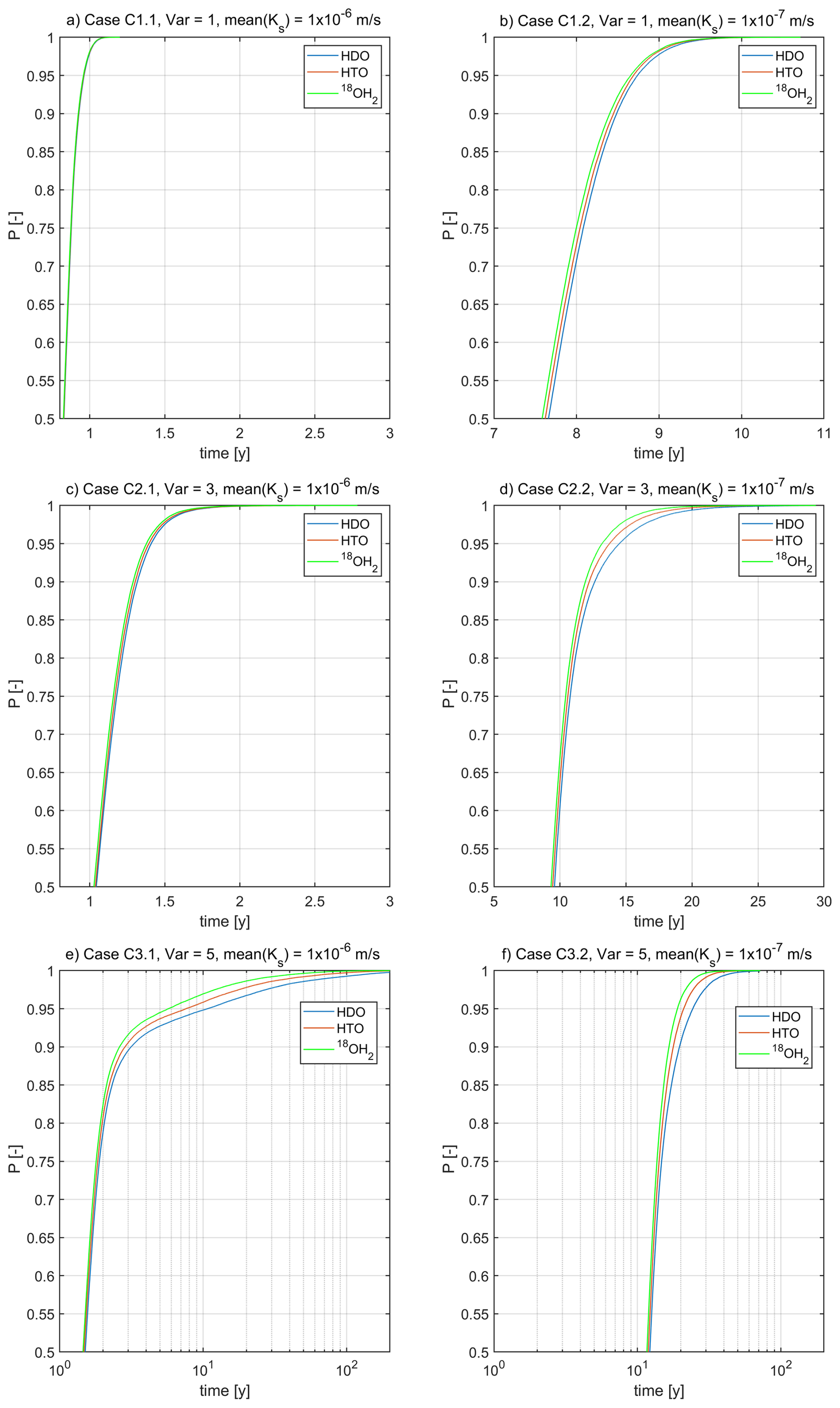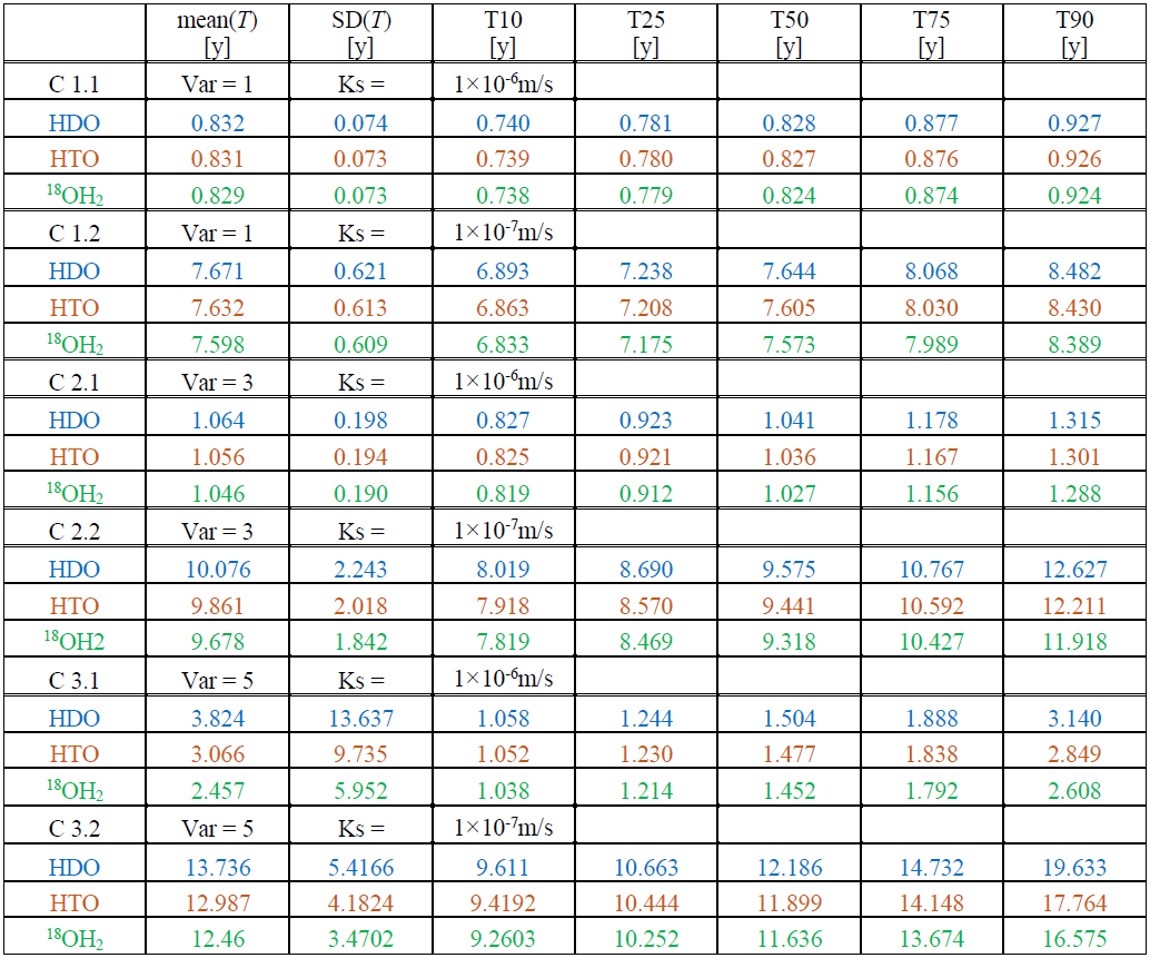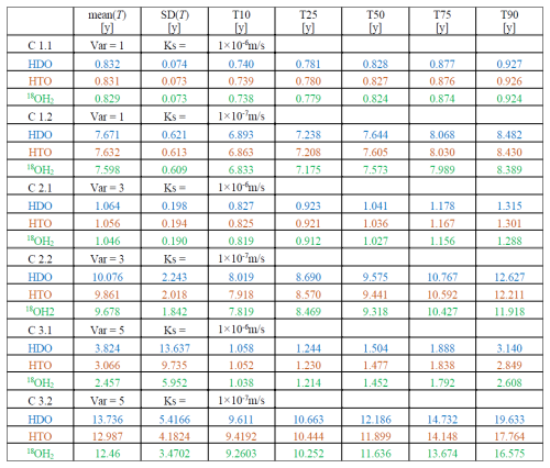 Significant absolute differences in the mean travel times of HDO and 18OH2 occur for C2.2 (var = 3, lower Ks) with approximately 0.4 years, and particularly for both cases with variance of 5 (C3.1 and C.3.2) with absolute difference of approximately 1.4 years. The case of the lower mean hydraulic conductivity corresponds to a relative difference of 10 %. For the higher mean hydraulic conductivity we observe, however, that HDO (mean(T) = 3.83 years) travels on average 50 % slower than 18OH2 (mean(T) = 2.46 years). The reason for this high relative difference is that the 10 times higher conductivity leads to earlier first arrival while the travel times still exhibit very long tailing with substantial differences between the isotopes. Note that for C3.1 differences in the mean travel time of HDO (mean(T) = 3.83 years) and HTO (mean(T) = 3.1 years) are with approximately 0.75 years, substantially larger than the differences reported by Rodriguez et al. (2021) for the respective median travel times. To summarize, we argue that standard deviations of travel times are distinct among the isotopes, particularly when considering larger variances in hydraulic conductivities. Maximum relative differences amount to 20 % between HDO and HTO as well as HTO and 18OH2 (C3.1 and C3.2), which implies that the dispersion will vary by approximately 40 %.