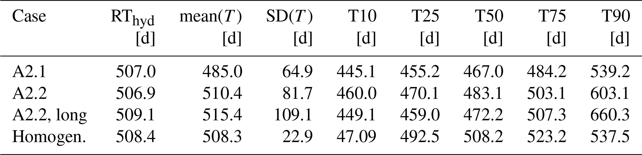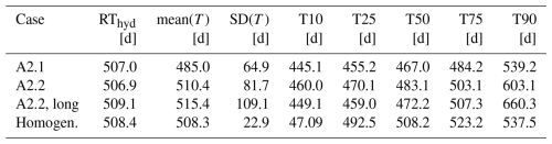 Table 1Mean travel time (mean(T)), standard deviation (SD(T)), as well as the 10 %, 20 % 50 %, 75 % and 90 % quantiles (T10, T25, T50, T75, T90) for cases shown in Fig. 4. For convenience we includehe hydraulic retention time, RThyd.