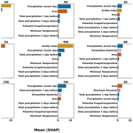 SHAP values quantify each feature’s contribution to individual predictions, providing insights into local and global influences on the target variable (Lamane et al., 2024). By applying SHAP analysis to the test sets for the 7 sets of models, model interpretability is assessed on unseen data. This approach allows for the evaluation of generalization performance and feature influence during the independent testing period. SHAP, derived from cooperative game theory, is a powerful explainable AI tool used to interpret the outputs of machine learning models (Lundberg and Lee, 2017). For each prediction in the test set, SHAP values represent the extent to which a feature contributes to deviations from the mean prediction (Wang et al., 2016; Xu et al., 2024). Compared to feature importance derived from Gini impurity, SHAP is more robust as it provides insights into both the direction and magnitude of the relationship between predictors and the target variable and enables analysis of local and global effects (Lundberg et al., 2020; Lundberg and Lee, 2017). See equations for SHAP calculation in Appendix C.