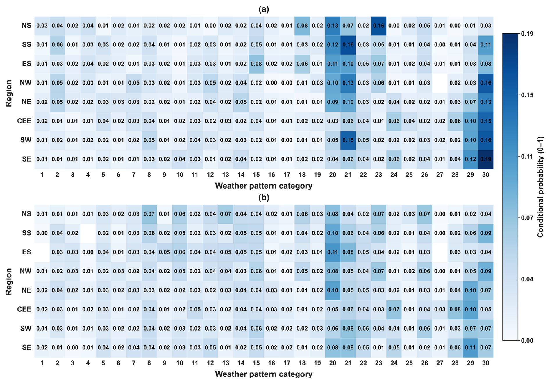 Figure 2Conditional probabilities of WPs associated with flood days. Panel (a) shows conditional probabilities on the day of the flood, and panel (b) shows probabilities of the AWPs three days prior to the flood. Regions are indicated on the y axis (abbreviated as in Table A3) and WP categories on the x axis. The color scale represents the conditional probability value between 0 and 1, with blank cells indicating no recorded events for that region–WP combination.