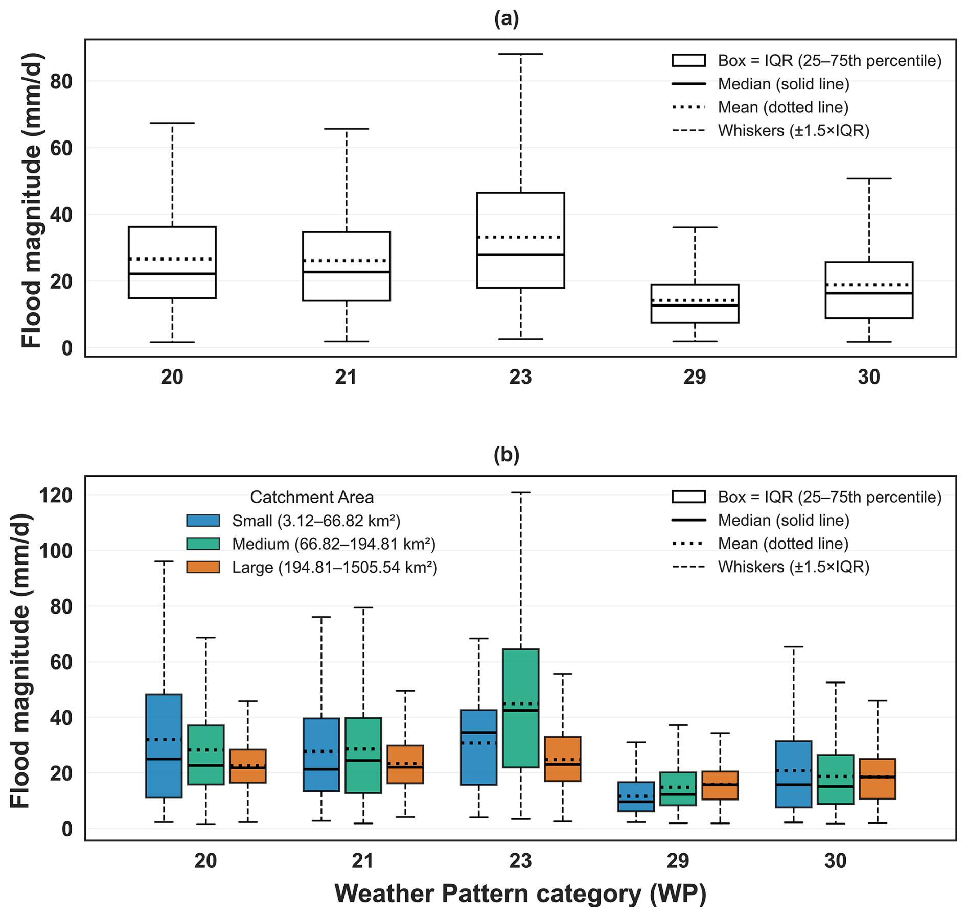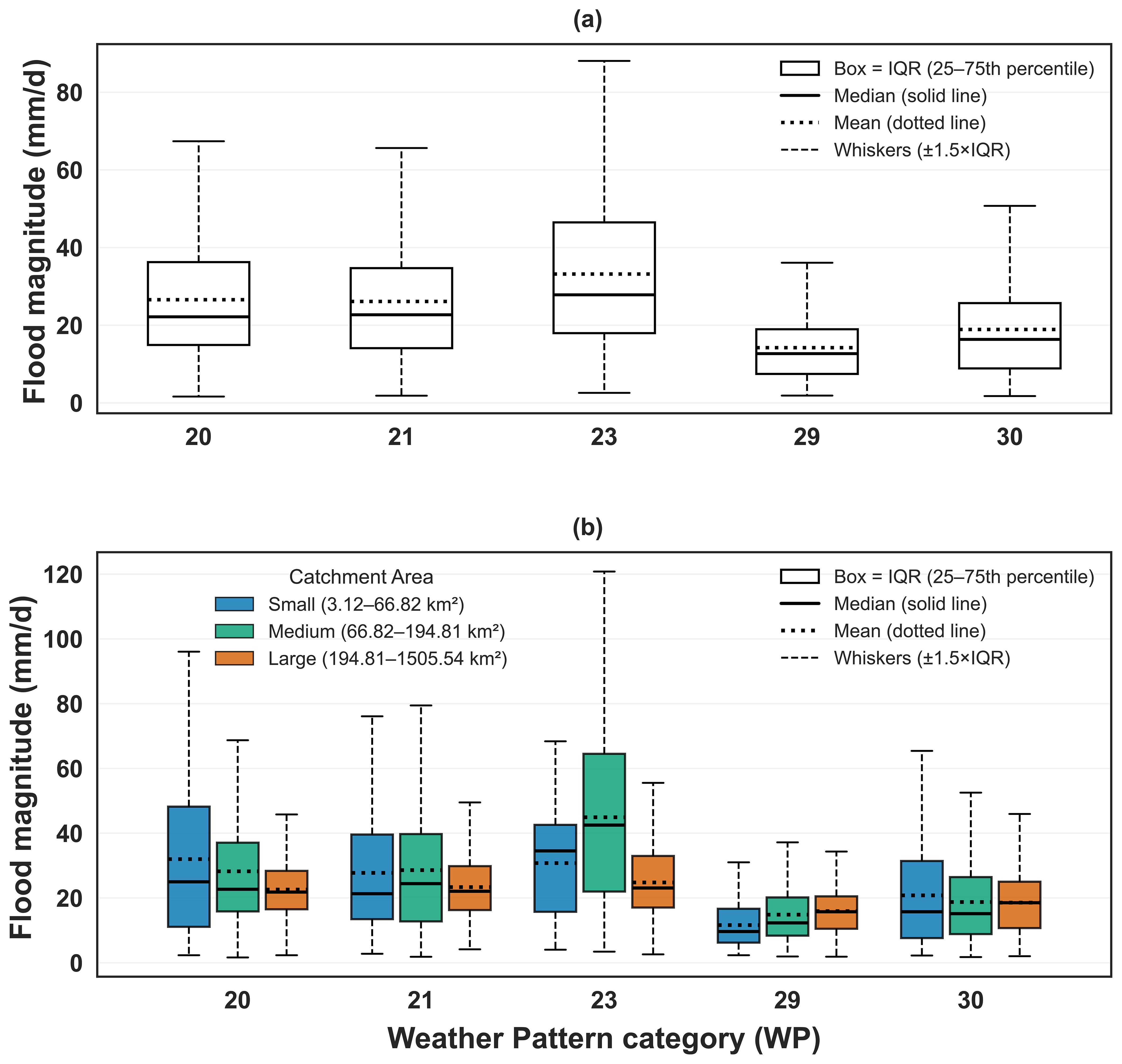Figure 3Comparison of flood magnitude (mm d−1) distributions under selected weather patterns (WPs 20, 21, 23, 29 and 30). Panel (a) shows the distribution across all natural catchments. Panel (b) shows the distribution stratified by catchment area: Small (3.12–66.82 km2), Medium (66.82–194.81 km2), and Large (194.81–1505.54 km2). These terciles are equally sized to represent three bins of catchment area data. Boxplots show the interquartile range (IQR; Q1–Q3), the median as a solid black line, and the mean as a black dotted line; whiskers extend to 1.5 × IQR, and outliers beyond that are omitted for clarity.