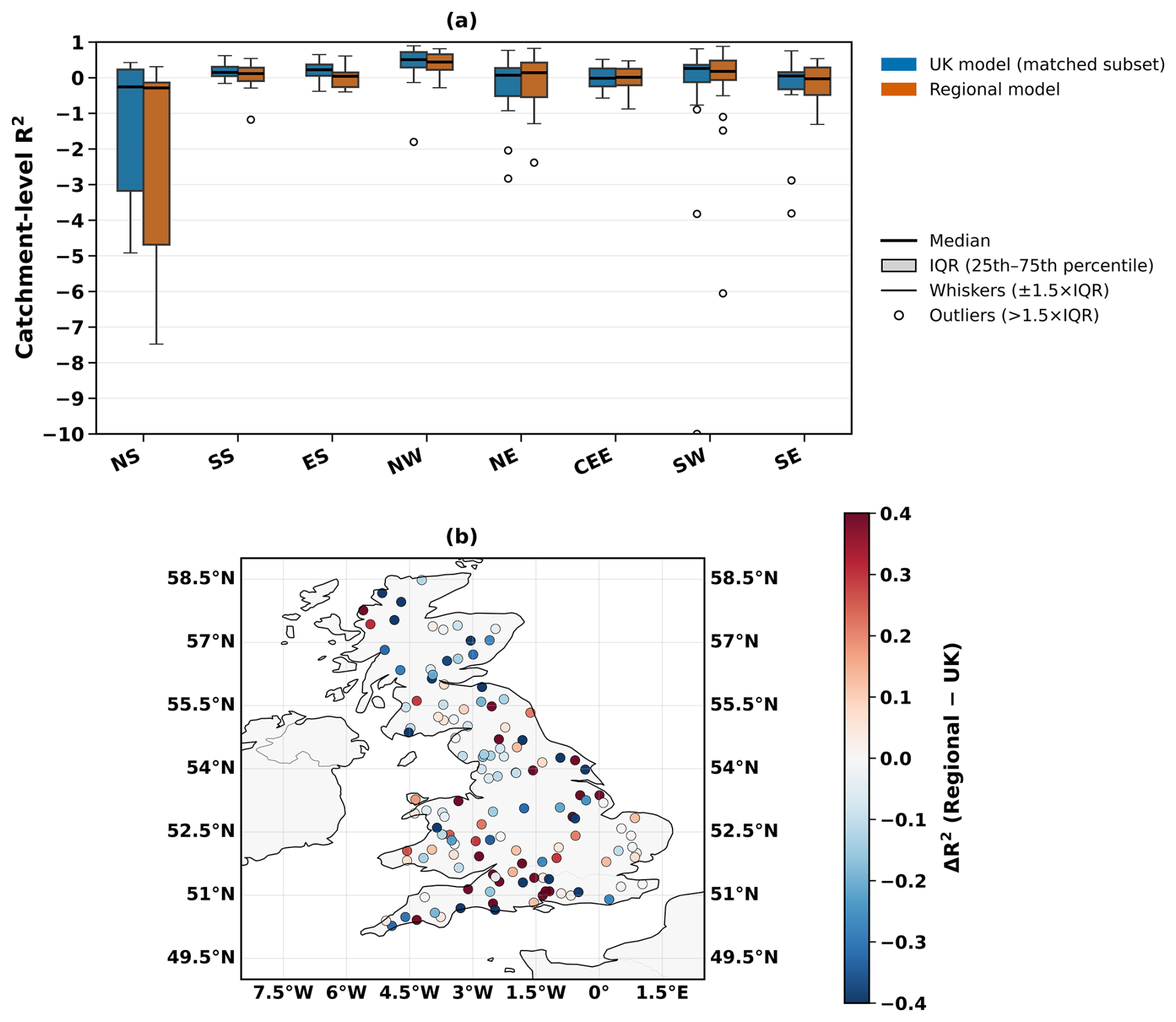 Figure 5Comparison of UK and regional model performance at the catchment scale. (a) Boxplots of catchment R2 for matched catchments across regions. Each box shows the interquartile range (IQR; 25th–75th percentile) with the median as a solid black line. (b) Spatial distribution of ΔR2 differences across the UK, where red shading indicates higher performance of the regional model and blue shading indicates higher performance of the UK model.