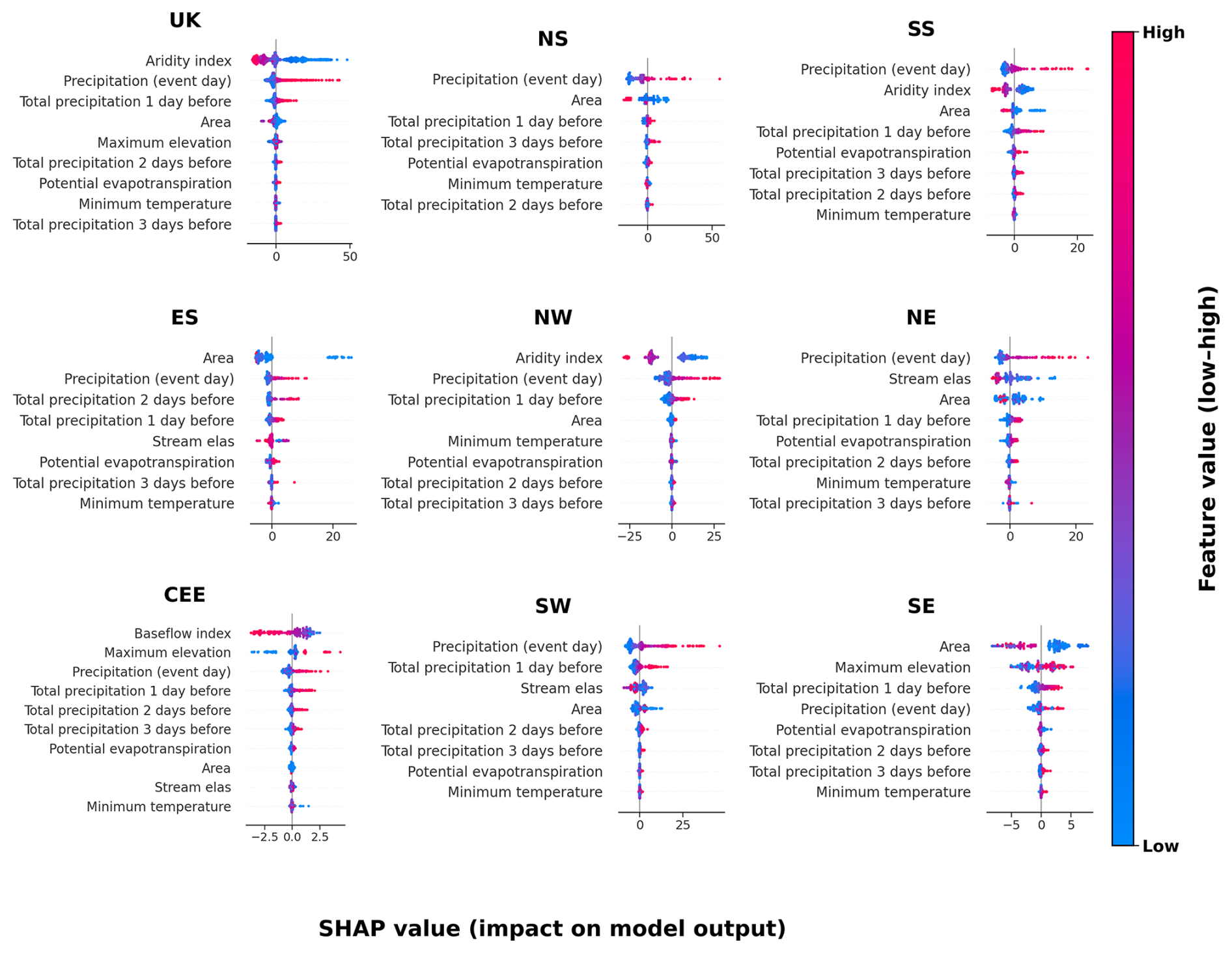 Across the UK and regional feature set 7 models, the most influential predictors (ranked by mean absolute SHAP value) generally combine climatic context with event-scale forcing, with event-day precipitation and related antecedent precipitation indices frequently appearing among the highest-ranked variables (Fig. 6). The SHAP value distributions indicate directionality, with higher precipitation values typically associated with positive SHAP values (higher predicted flood magnitudes) and lower precipitation values associated with negative SHAP values (Fig. 6). Predictor retention and relative importance vary between regions, reflecting differences in the final pruned feature sets (Fig. 6).