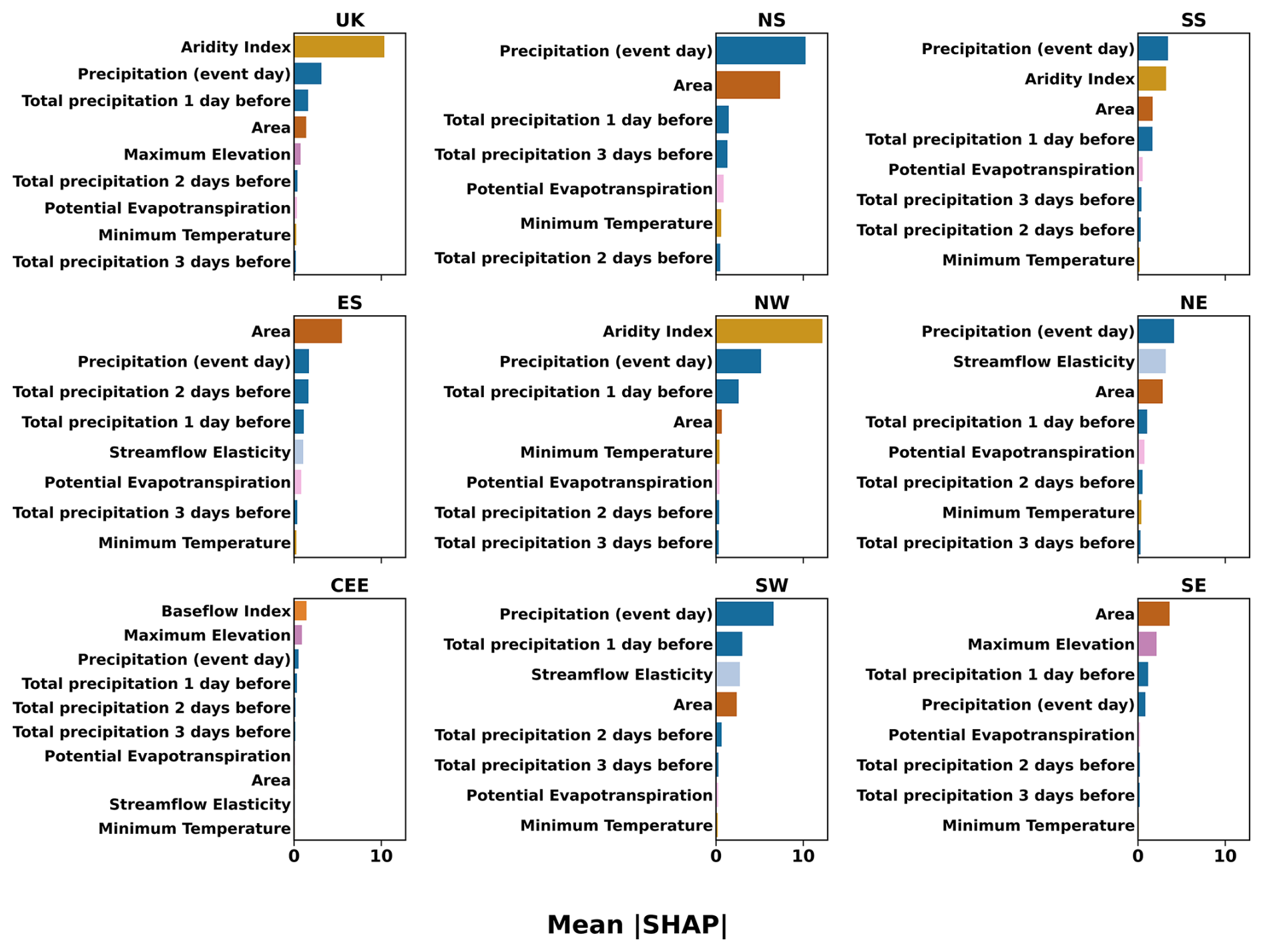 Across the UK and regional feature set 7 models, the top ten predictors ranked by mean absolute SHAP () show that the UK model is dominated by climatic context and precipitation forcing, with the aridity index as the most influential predictor, followed by event-day precipitation and antecedent precipitation indices (Fig. 7). Regional rankings show both similarities and differences relative to the UK model: precipitation-related predictors remain prominent in several regions, while some regions show a larger contribution from static catchment attributes (e.g., baseflow index, area, or elevation) among the top-ranked predictors (Fig. 7).