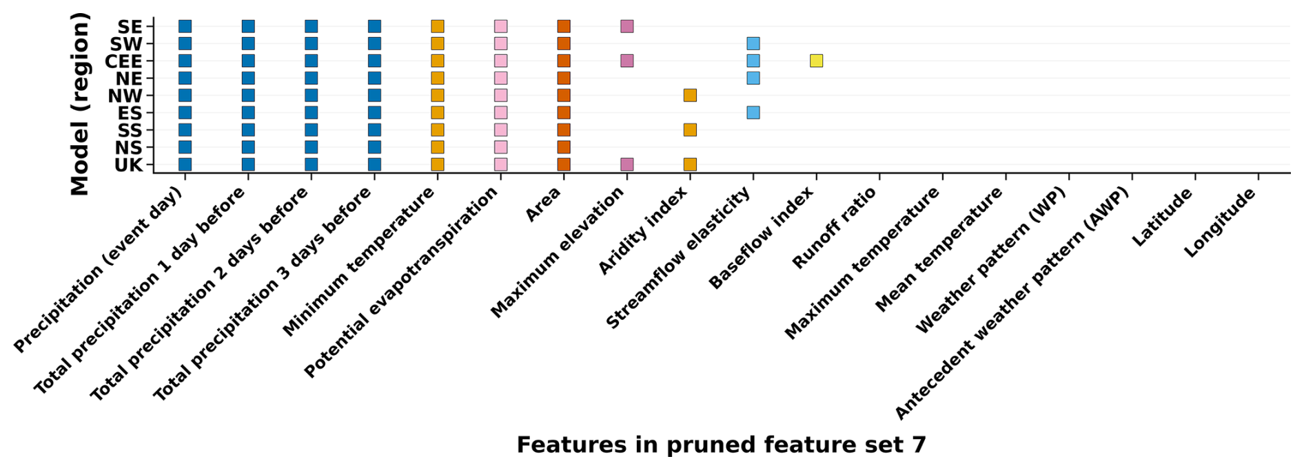 WP and AWP predictors were also removed prior to final pruning. This decision was based on model comparison results across successive feature sets (Fig. 4), which showed that adding WP and AWP predictors did not improve test-set performance relative to the baseline in most regions and, in some cases, reduced skill. Removing WP/AWP prior to collinearity pruning therefore simplified the model without loss of predictive performance, and ensured that the final specification emphasized event-scale and catchment-relevant drivers of flood magnitude.