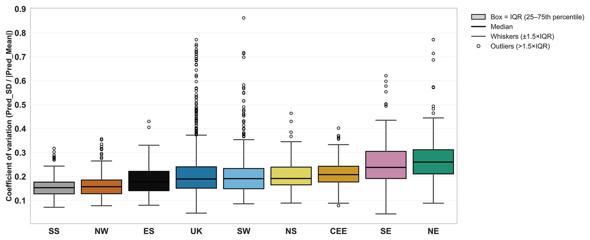 Figure B2Ensemble-based relative uncertainty (Coefficient of Variation, CV) by region for the final feature-pruned models (Feature Set 7). The CV () rescales ensemble prediction spread by mean predicted flood magnitude, allowing comparison across regions with differing event scales. Boxes indicate inter-quartile range (25th–75th percentile), whiskers extend to 1.5 × IQR, and circles denote outliers. Lower CV values indicate higher ensemble agreement and lower predictive uncertainty. Regional models exhibit similar median CV values (≈0.15–0.25), while slightly higher uncertainty is observed in NE, SE, and NS.