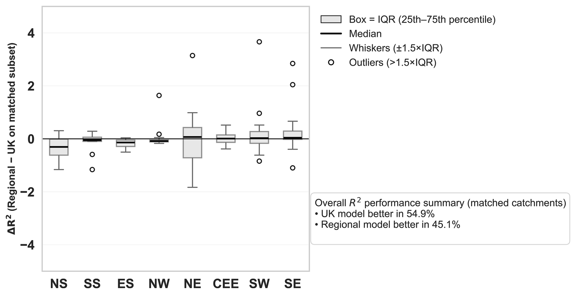 Figure B3Per-catchment performance difference between regional and UK models (ΔR2) for matched catchments (i.e. same catchments in regional and UK models). Positive values indicate higher regional model performance. Overall, the UK model achieved higher R2 in 54.9 % of catchments, while regional models performed better in 45.1 %. Boxplots show the interquartile range (IQR; 25th–75th percentile), with the median as a solid black line, whiskers extending to IQR, and outliers shown as points.