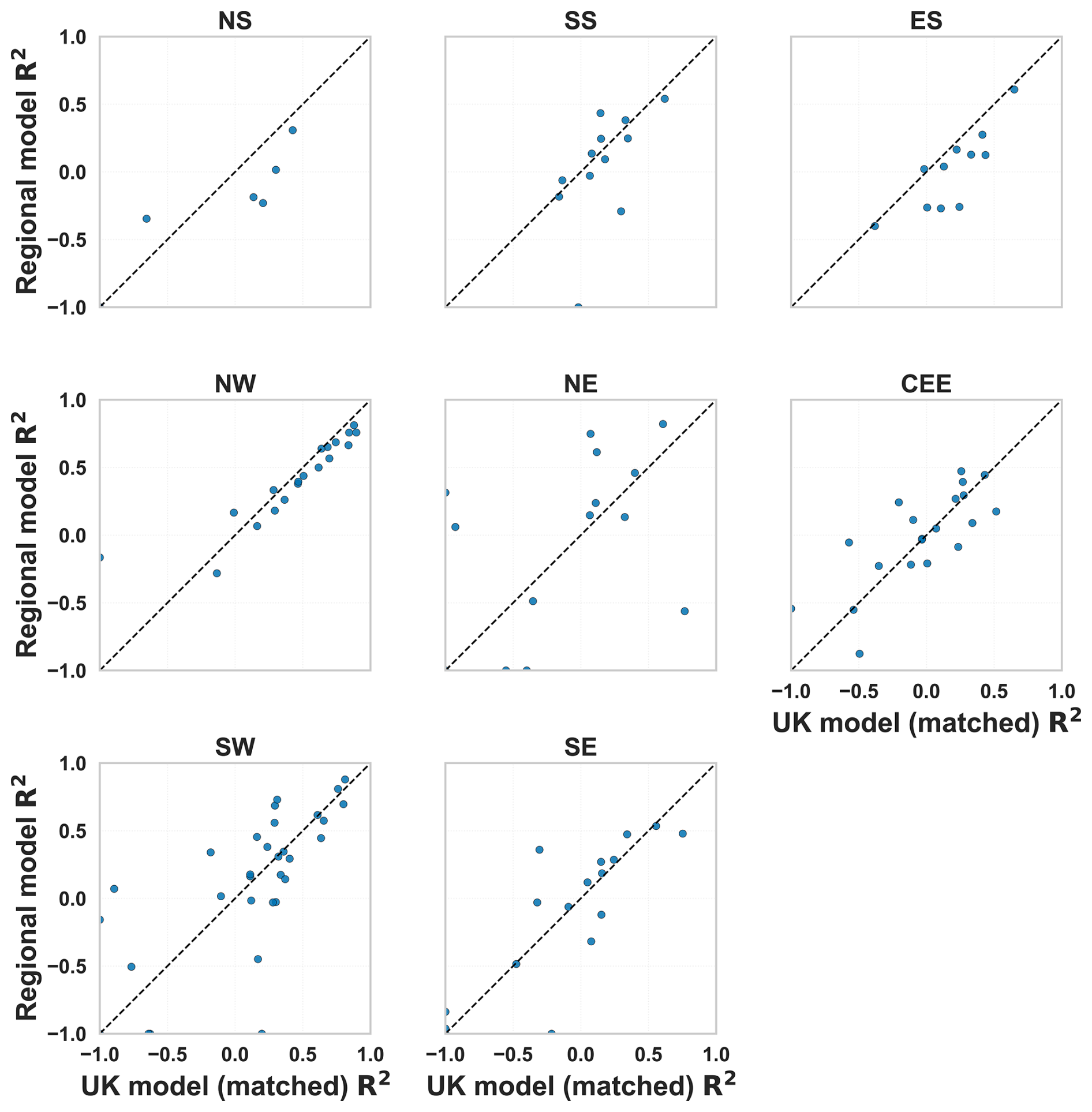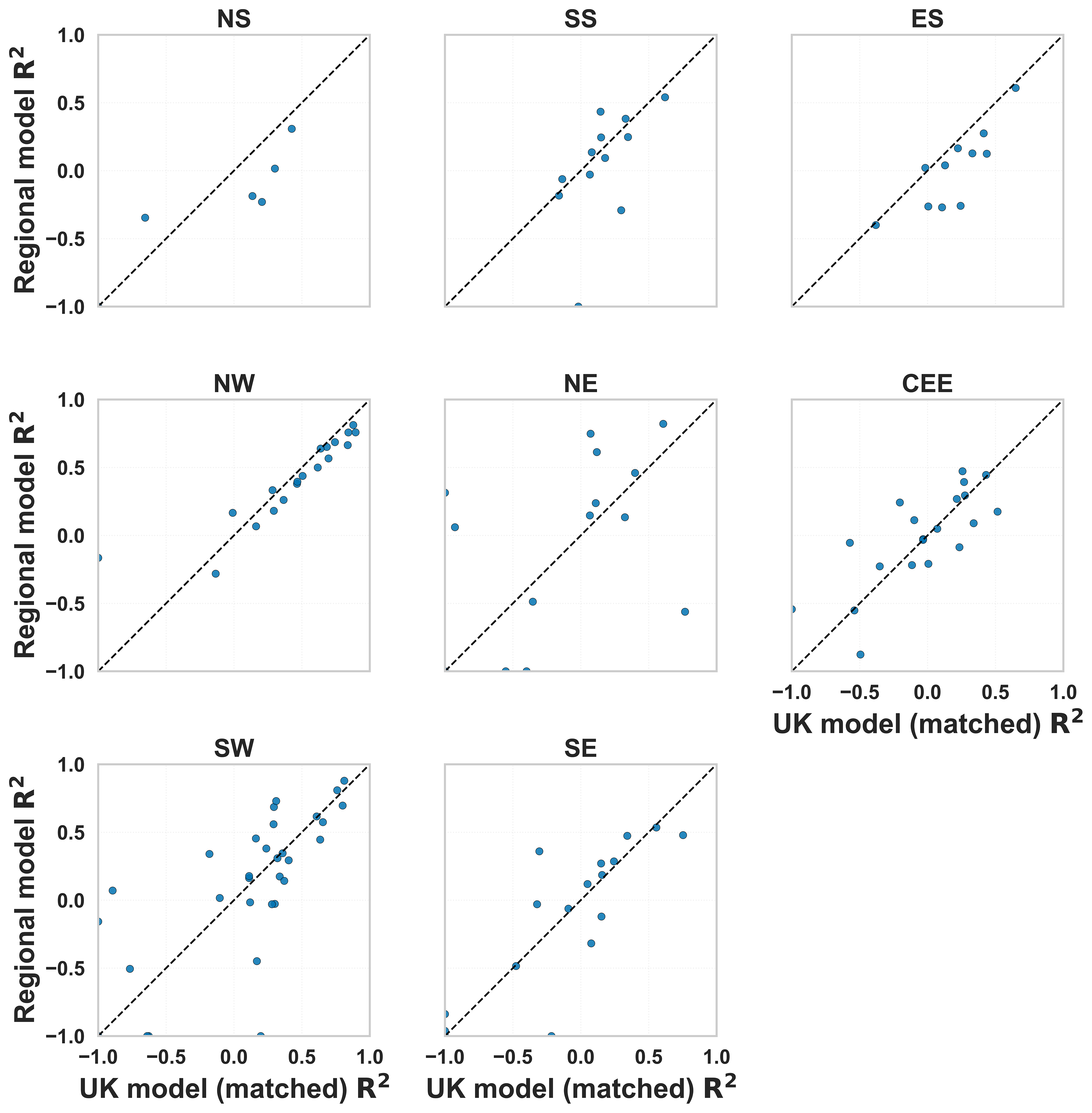 Figure B4Scatter plots of per-catchment R2 comparing UK (matched subset) and regional models for each region. Points above the dashed 1:1 line indicate catchments where the regional model achieved higher R2. While the UK model generally performs better overall, regional models outperform in some areas, indicating potential benefits of region-specific model calibration.