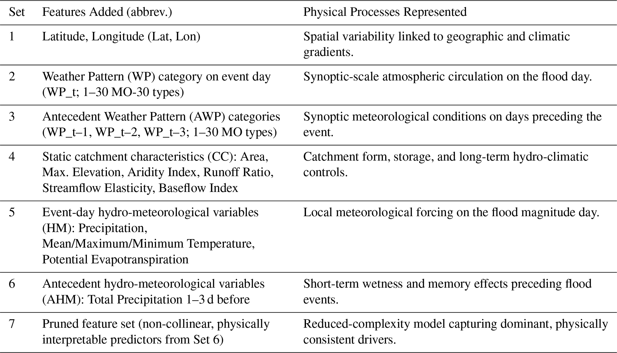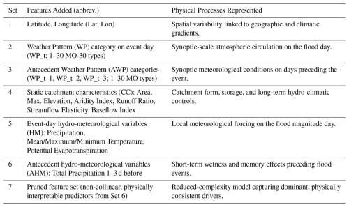 Feature set 7 corresponds to the final pruned model specification used in the main analysis. The initial predictor pool included geographic coordinates (latitude and longitude), synoptic WPs and AWPs, static catchment attributes, hydrometeorological event-day predictors, and antecedent hydrometeorological indices. Latitude and longitude were included initially to provide spatial context for synoptic circulation (i.e., the same WP can have different hydro-meteorological implications depending on location). However, as these coordinates are not physically interpretable predictors of flood magnitude and primarily act as spatial proxies, they were removed prior to the final pruning stage to ensure that the retained predictors remained physically meaningful.