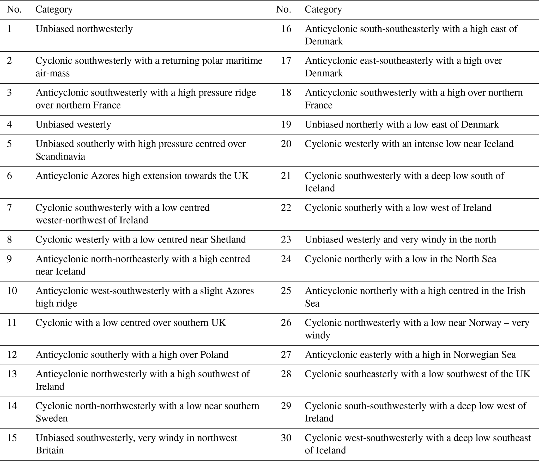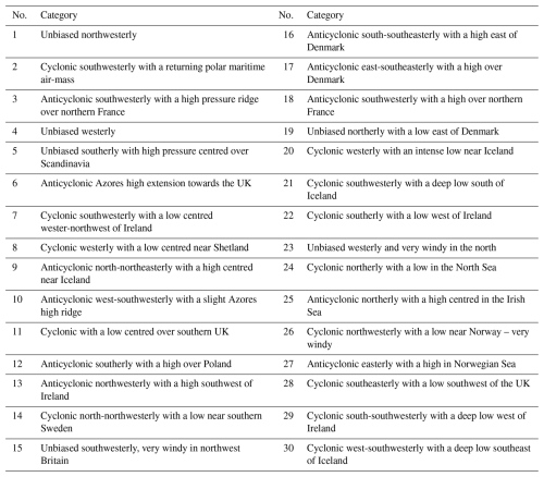 Table A1Descriptions of the MO-30 weather pattern categories, reproduced from the dataset provided by Neal et al. (2016).