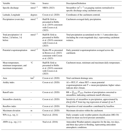 Daily streamflow (m3 s−1) data between 1969 and 2021 were obtained for UK Benchmark Catchments from the National River Flow Archive (NRFA), as described in Harrigan et al. (2018). The corresponding catchment-averaged precipitation, potential evapotranspiration, and temperature variables were obtained from CAMELS-GB (Coxon et al., 2025), derived from the Met Office HadUK-Grid Climate Observations from Hollis et al. (2019). A selection of static catchment attributes for each of the catchments were obtained from Coxon et al. (2020). The full list of extracted variables and calculated antecedent precipitation totals, used to capture the influence of precipitation during previous days, is presented in Appendix Table A2.
