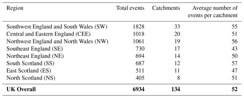 Our analyses focus on winter floods. The winter months of December, January, and February (DJF) were chosen for analysis because most of the largest flood events in the UK occur during this season (Ledingham et al., 2019). Extreme flood events above the 99th percentile were identified for each catchment between 1969 and 2021 using the Peak Over Threshold (POT) method (Rosso, 2015; Rodding Kjeldsen and Prosdocimi, 2023). The 99th percentile threshold was used to capture the most severe events while maintaining an adequate sample size. A 7 d independence window was applied, following Brunner and Dougherty (2022). The target variable for modeling was the flood magnitude, defined as the largest specific-discharge value (mm d−1) for each independent event. The resulting sample sizes and regional breakdown of catchments and independent flood events are summarized in Appendix Table A3.