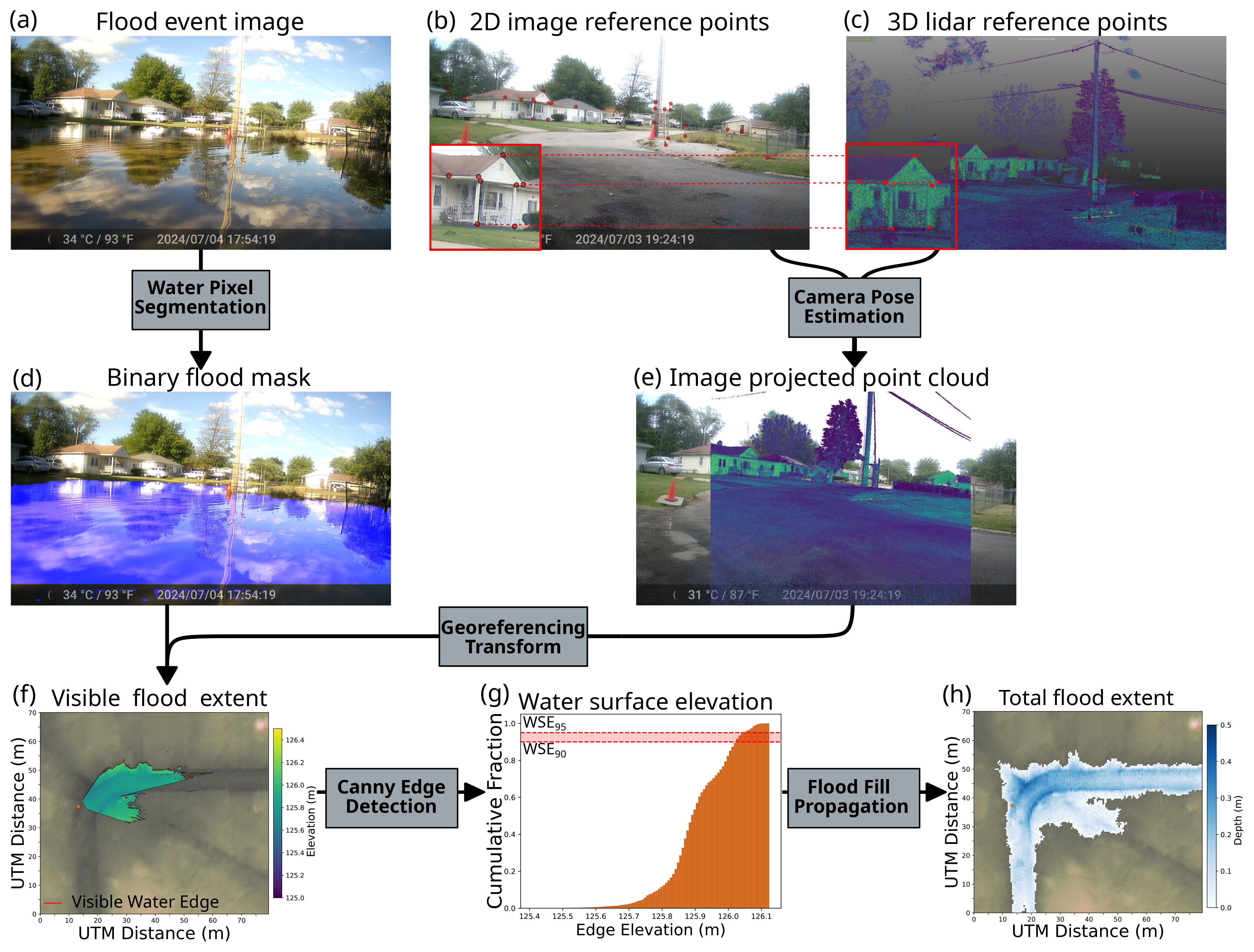 Figure 2Procedure for estimating flood extent from a flooded image at Site B. Image and point cloud reference features are used to estimate camera pose and project points onto the image plane. The intersection with the flood mask gives the visible flood extent. Water surface elevation (WSE) is extracted from the edge elevations and propagated for the final, total flood extent.