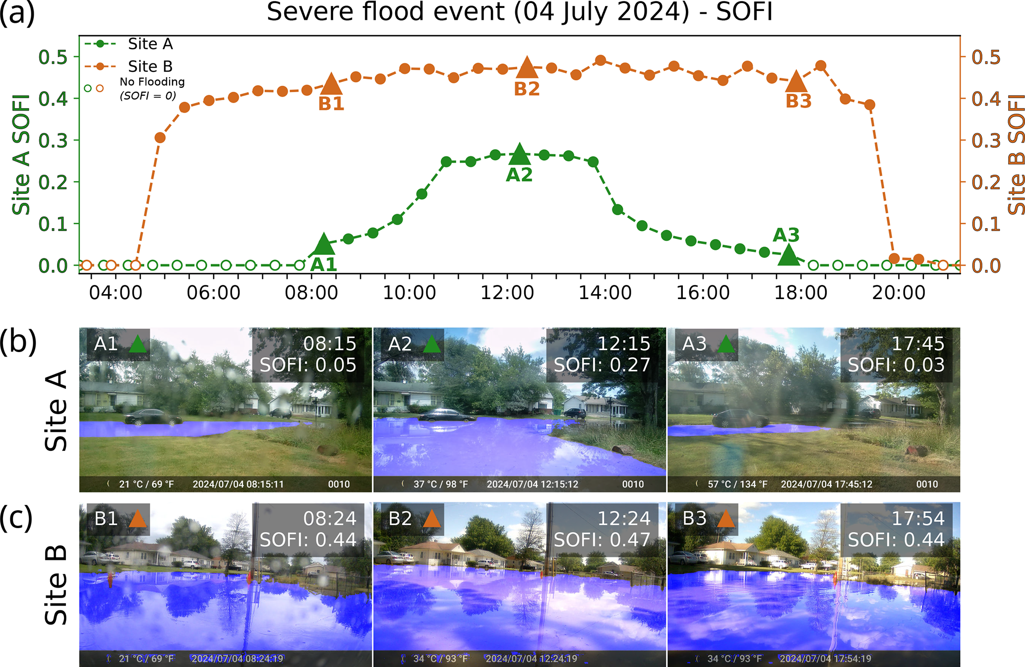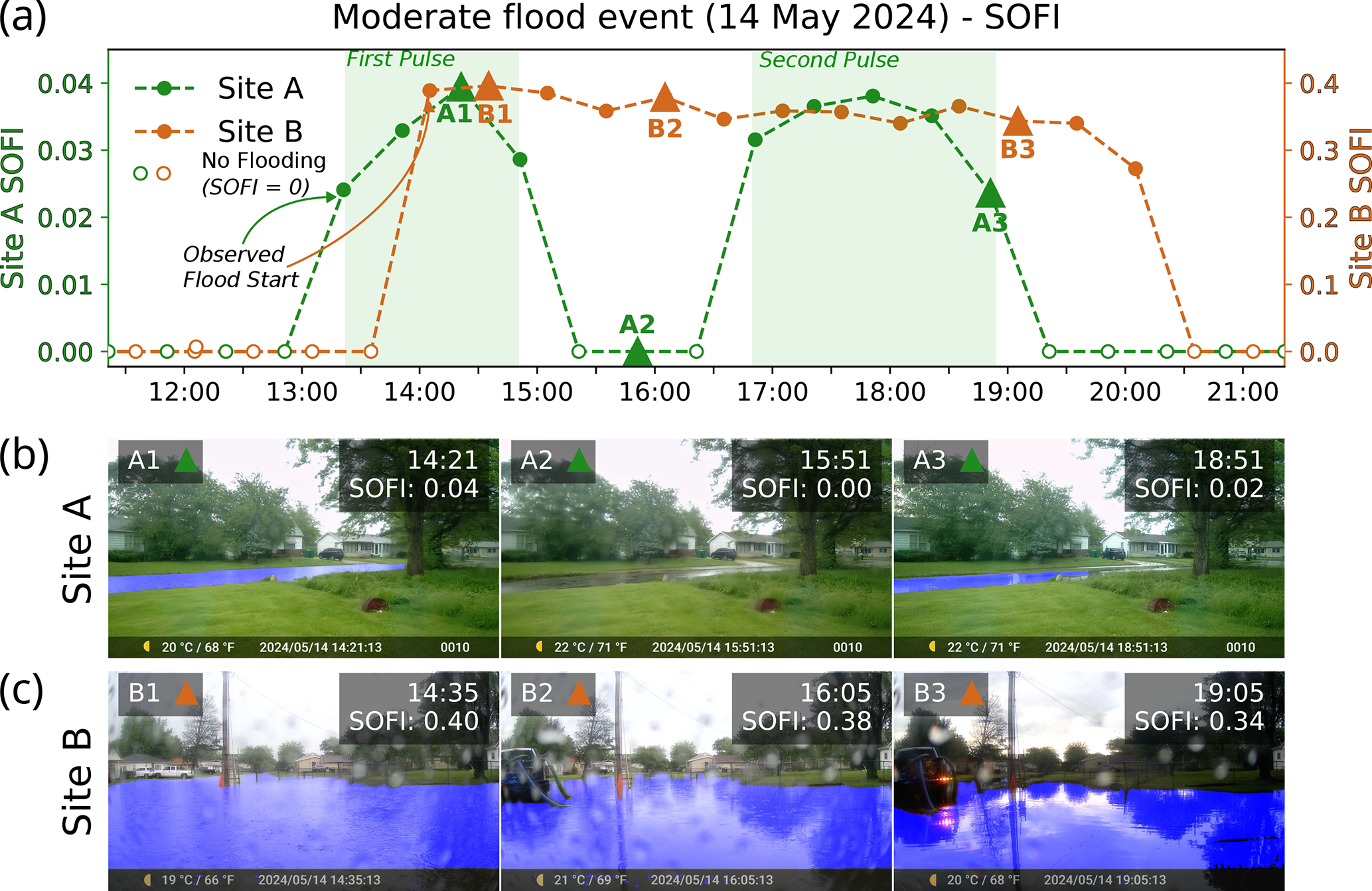 Figure 3(a) SOFI time series for 14 May moderate severity case study event. Representative flooded images from (b) Site A and (c) Site B. Segmented flood masks are shown in blue.