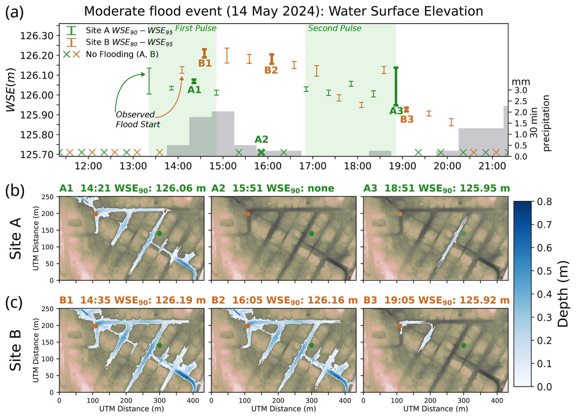 Figure 5(a) Water surface elevations (WSE) estimated from image-lidar projection for the 14 May case study event. Flood-fill extents propagated from WSE90 at (b) Site A and (c) Site B.