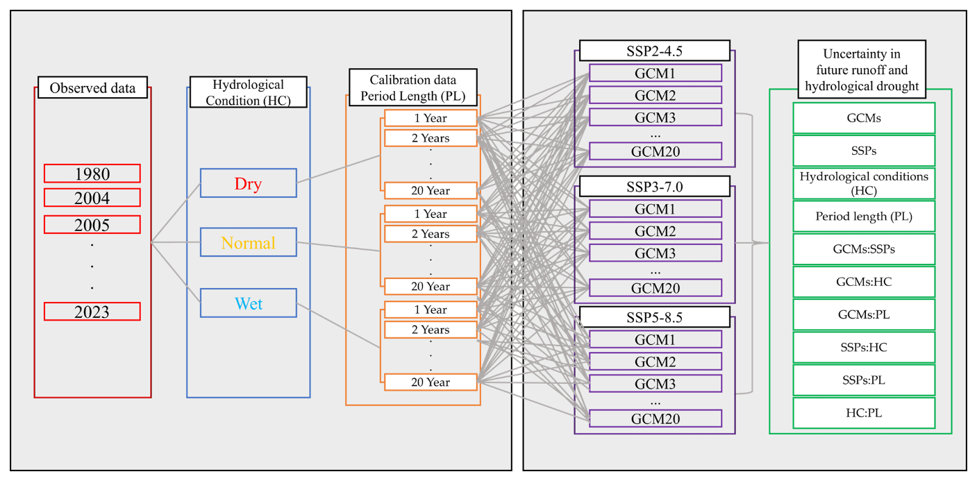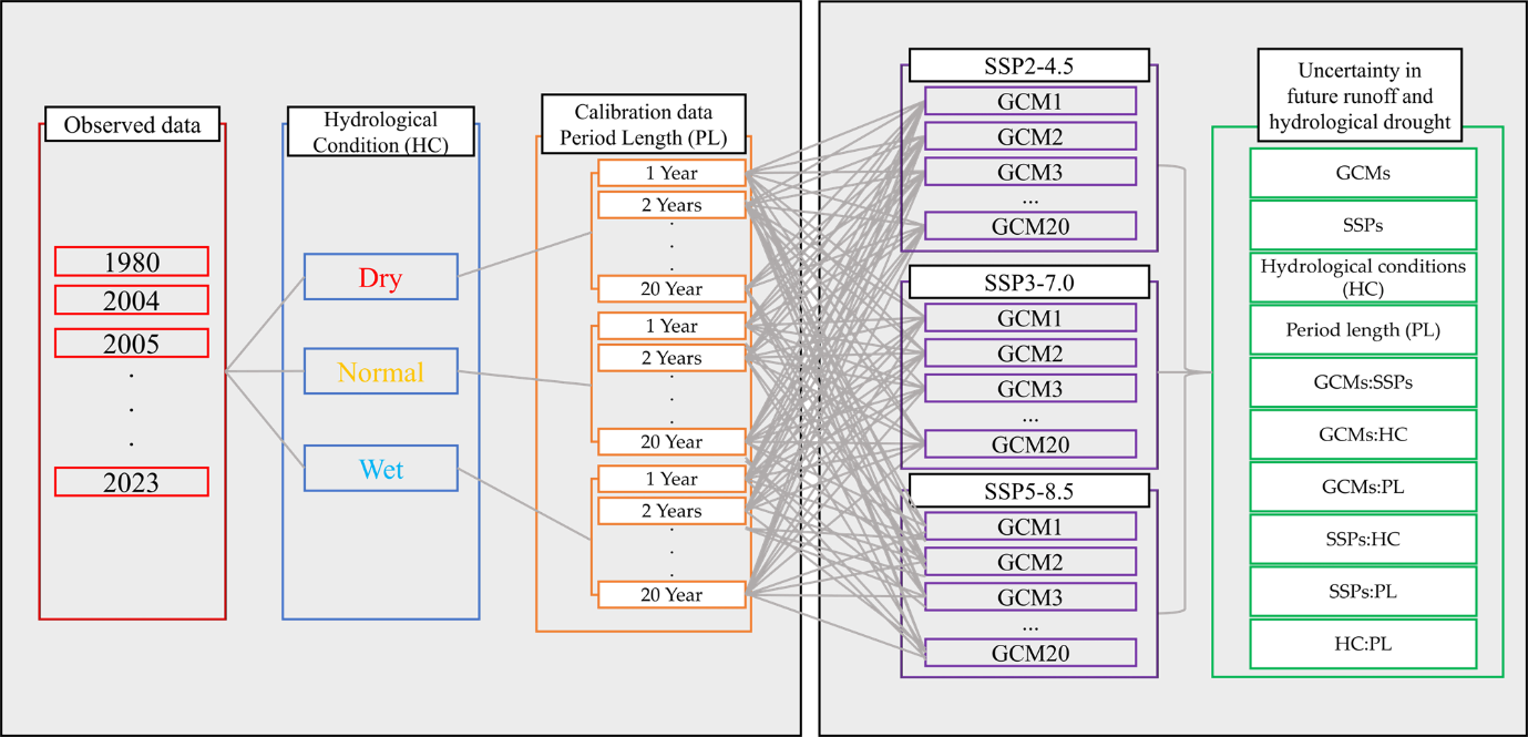 This manuscript is structured as follows. In Sect. 2, the study area, datasets, and the methodologies used in this study are described, including SWAT, the ANOVA framework, and the statistical validation procedures. In Sect. 3, the results of the analysis are presented, showing the effects of calibration conditions on model performance and quantifying the uncertainty contributions from various sources for both future runoff and hydrological drought. In Sect. 4, the implications of these findings are discussed in the context of previous research. Finally, Sect. 5 summarizes the main conclusions of this study.