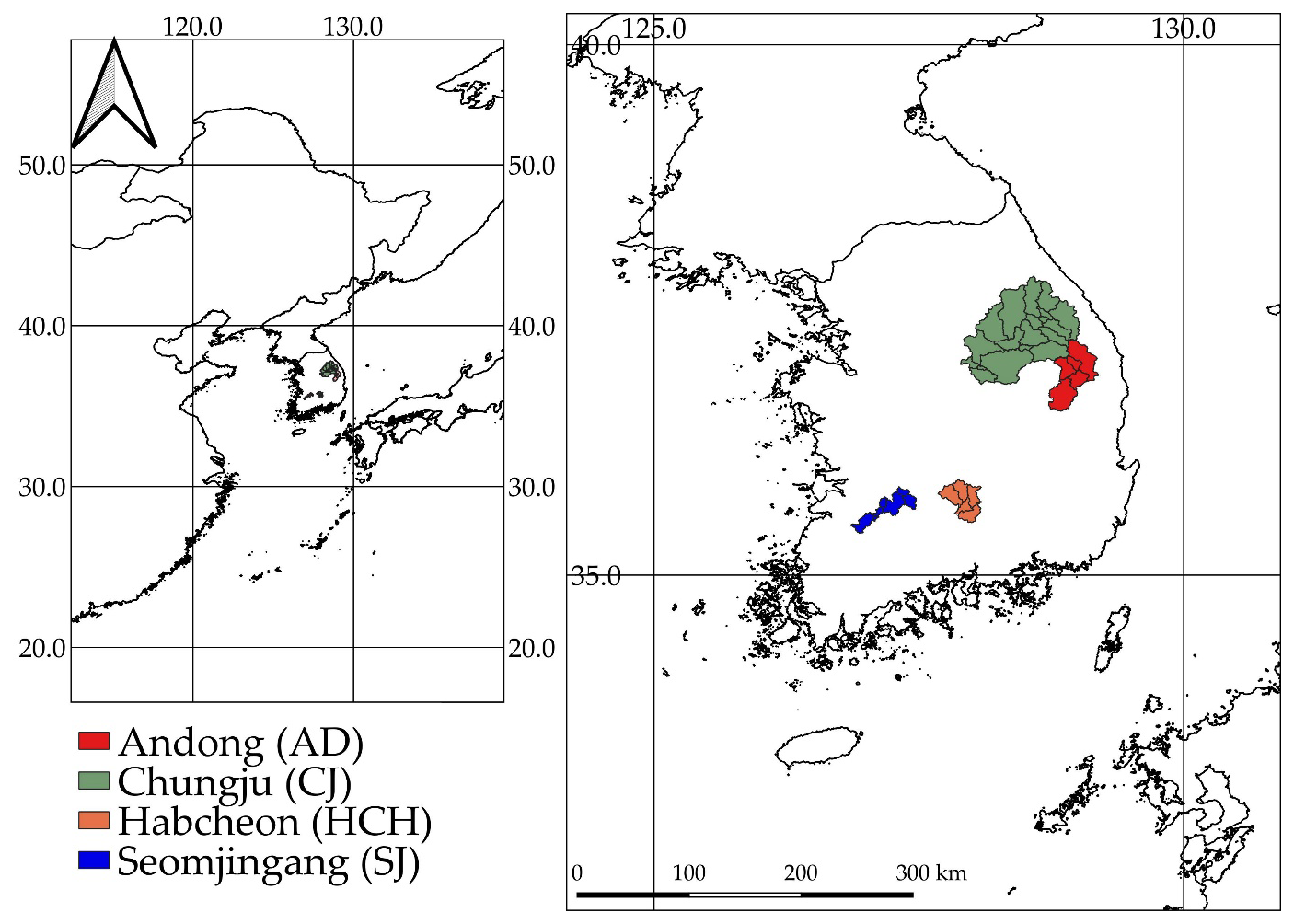 The study areas selected in this study are the Andong (AD), Chungju (CJ), Habcheon (HCH), and Seomjingang (SJ) dam basins located in Korea as shown in Fig. 2. To achieve stable calibration and validation results for a hydrological model, it is imperative to choose catchments with extensive hydrological data records. This enables the accurate estimation of appropriate calibration data lengths through various testing periods of the hydrological model. Furthermore, incorporating a variety of basins is crucial to ensure that the findings of this study are not biased by specific hydrological conditions. These four basins, which have the longest hydrological records in Korea, are situated in major river basins. Detailed basin characteristics are provided in Table S1 in the Supplement. While all four basins are located in temperate climate zones and are predominantly forested (Forest ratio > 75 %, except for CJ at 61.7 %), they represent a diverse range of hydrological and climatic conditions. While all four basins are located in temperate climate zones and are predominantly forested (Forest ratio > 75 %, except for CJ at 61.7 %), they represent a diverse range of hydrological and climatic conditions. Area varies significantly from 763 (SJ) to 6648 km2 (CJ). Mean annual precipitation also ranges from 1045.7 (AD) to 1329.8 mm (SJ). These regions are devoid of artificial structures (Urban ratio < 5.3 % for all basins), ensuring that runoff remains natural and unaltered. Located in different regions of Korea, these basins have a range of hydrological conditions and runoff characteristics, providing a representative cross-section of the country's hydrological characteristics.