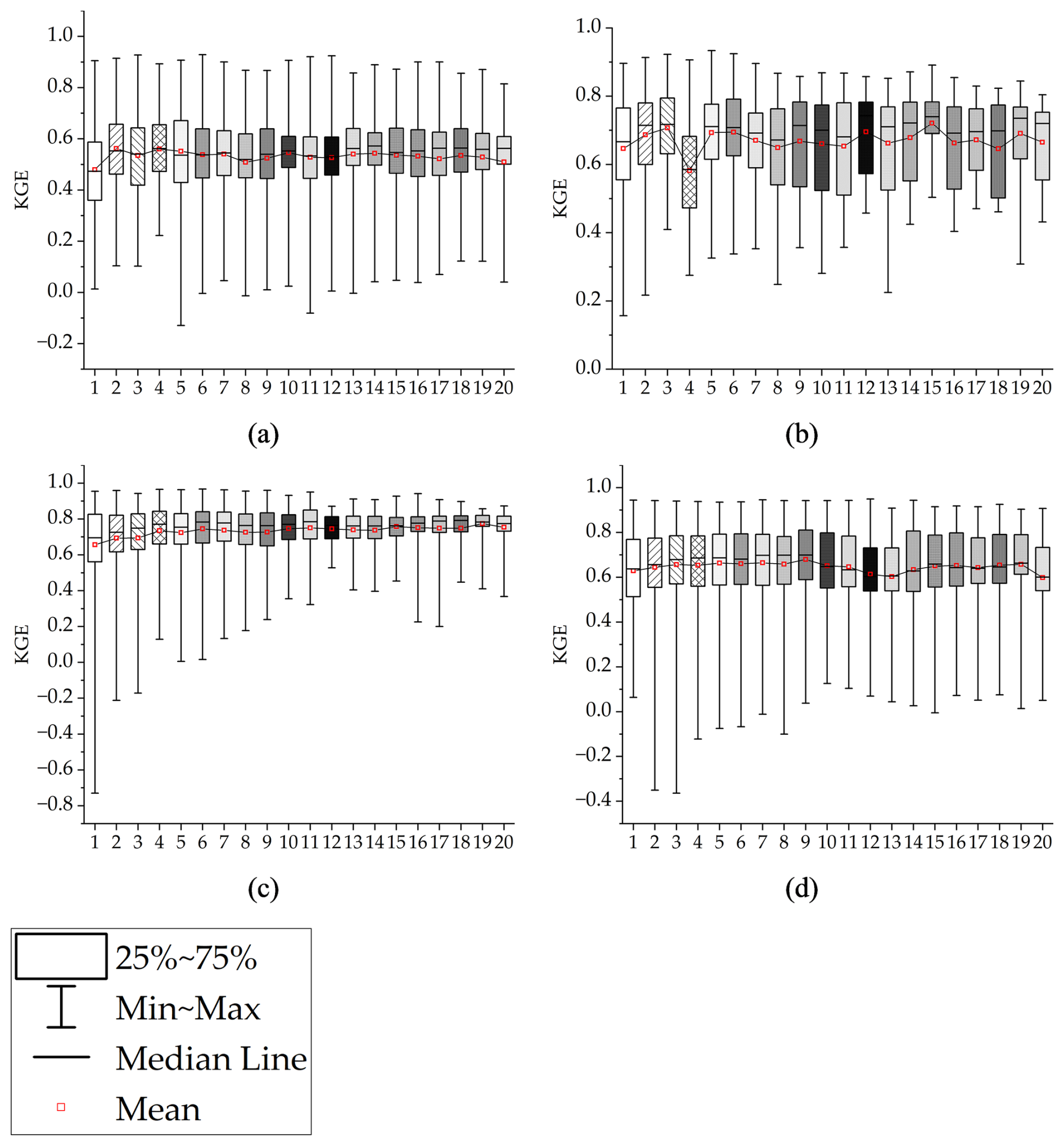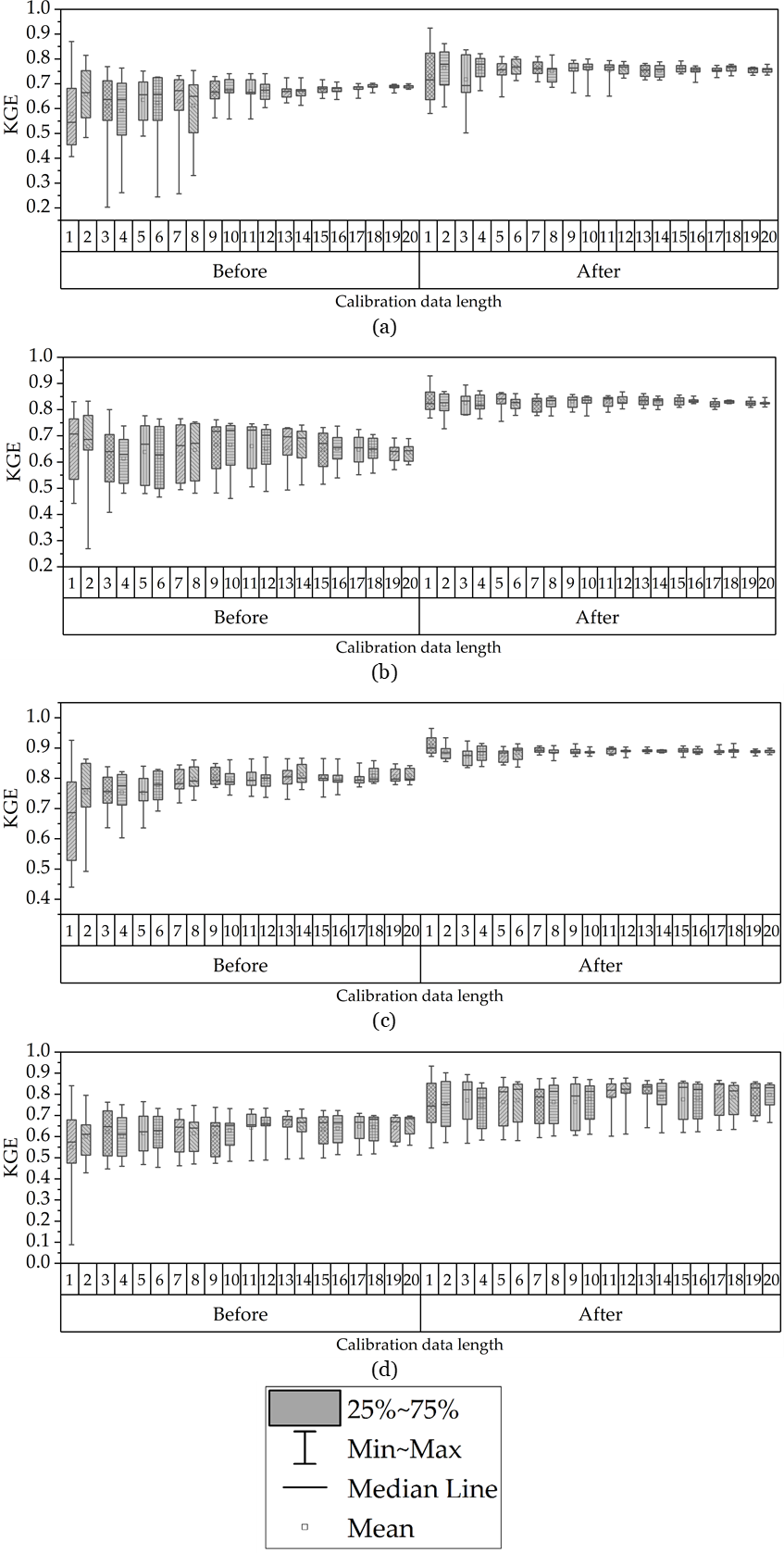 Figure 3Comparison of KGE values for the four basins using default parameters (Before) and calibrated parameters (After). (a) is AD, (b) is CJ, (c) is HCH, and (d) is SJ. The x-axis (1–20) represents the calibration data length, which defines the before calibration/after calibration data split.