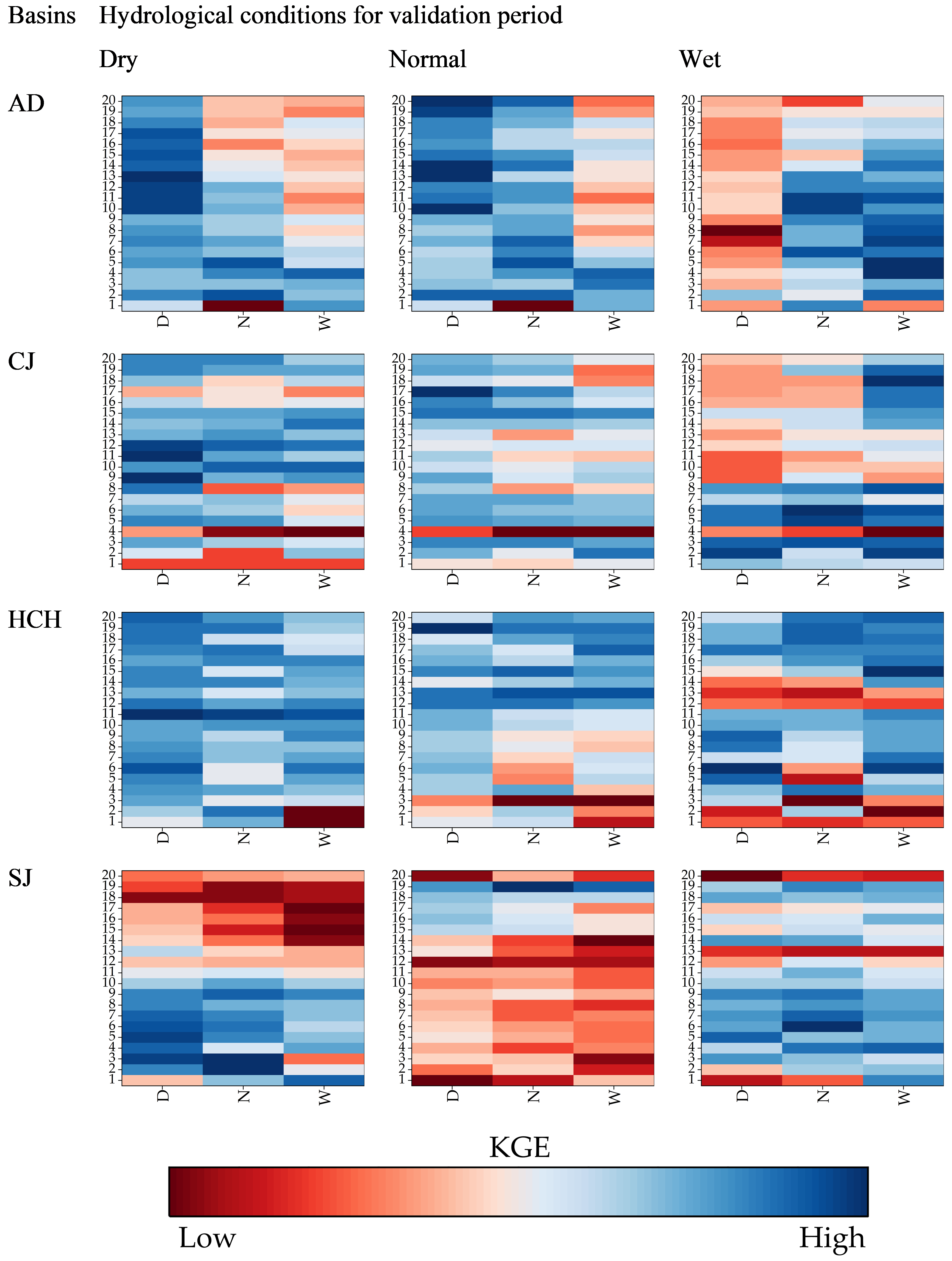 Figure 5Heatmap matrix of KGE performance by calibration and validation conditions. The four main rows represent the basins (AD, CJ, HC, SJ). The three main columns (labeled “Dry”, “Normal”, “Wet”) represent the hydrological conditions of the validation period. Within each individual heatmap, the y-axis represents the calibration data length (1–20 years), and the x-axis (labeled D, N, W) represents the hydrological conditions of the calibration period. Blue indicates high KGE (good performance) and red indicates low KGE (poor performance).