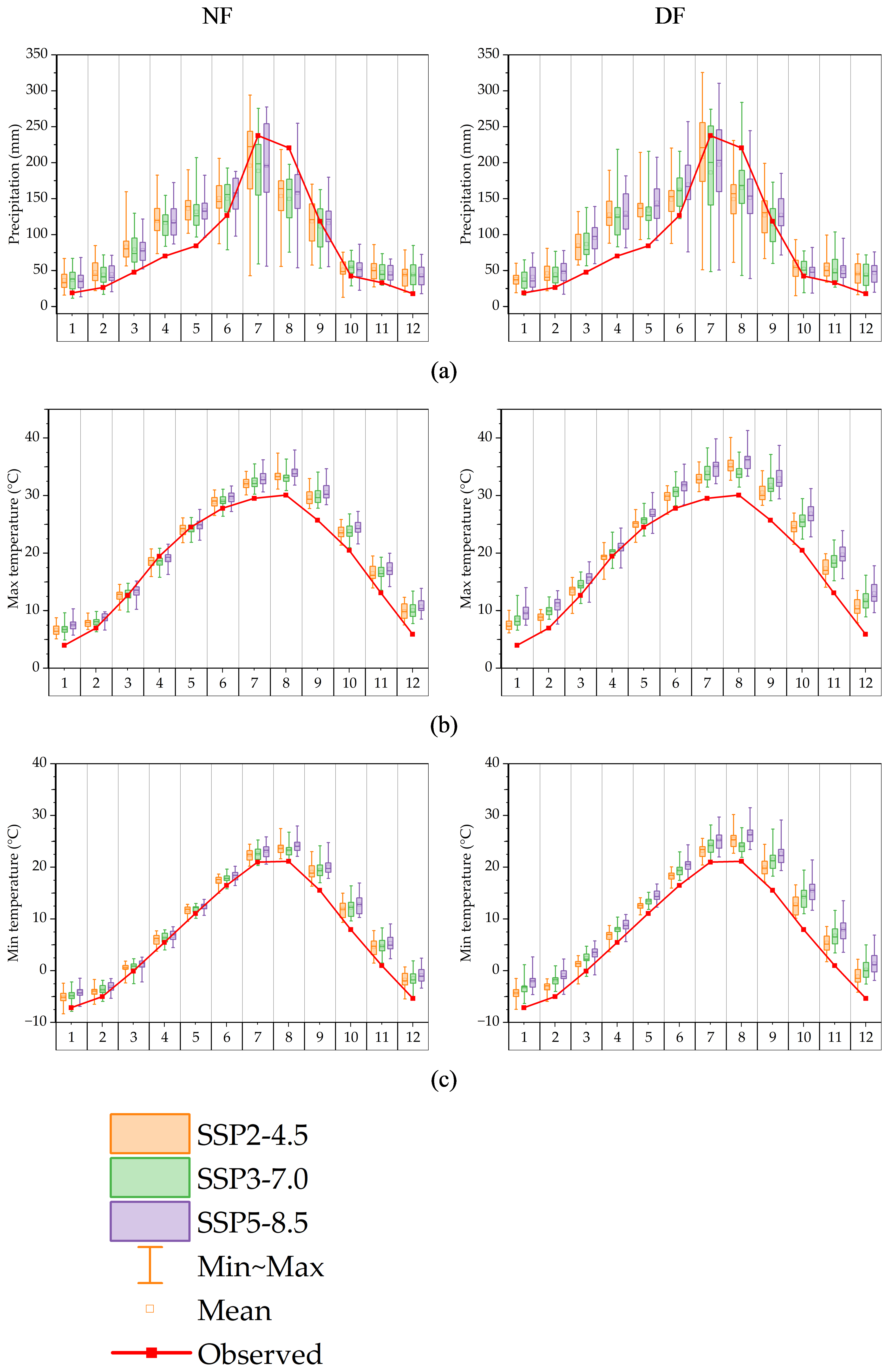 With regard to maximum temperatures, the analysis shows that there has been an increase in all months except April in NF, especially in fall (September–November). This increase was more pronounced in the DF than in the NF, with the largest increases observed under SSP5-8.5. Similarly, the minimum temperature was found to have increased in the future compared to the past, following the same trend as the maximum temperature.