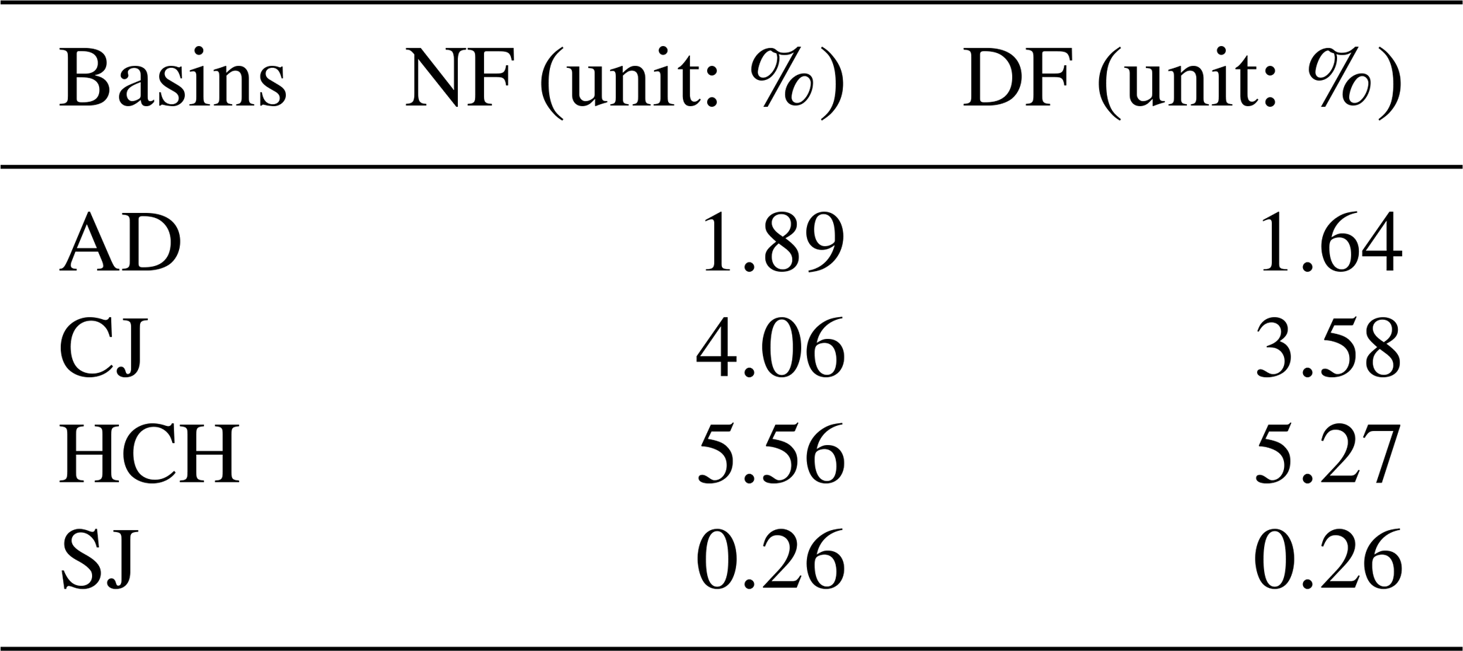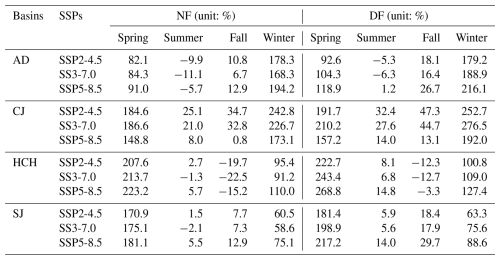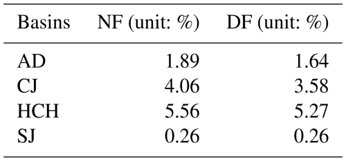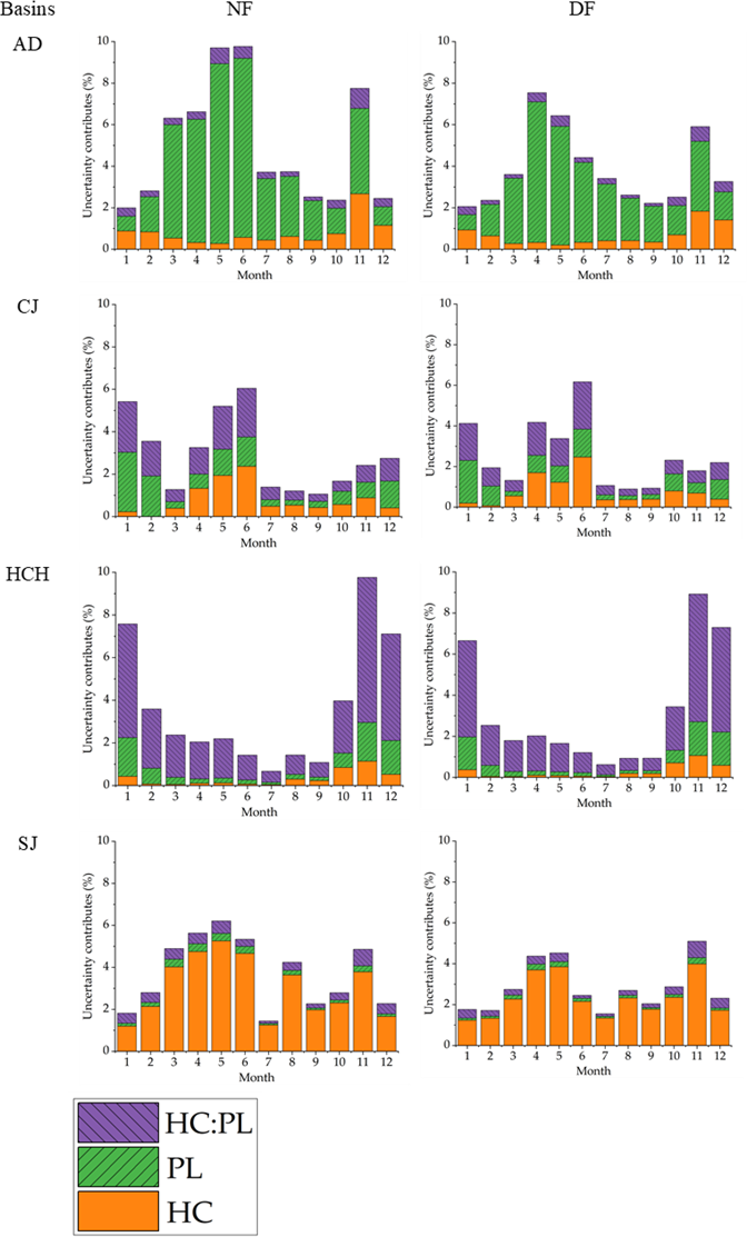 The uncertainty contributions from hydrological models were most significant during the spring (March–May) and winter (December–February) periods, as shown in Table S5 in the Supplement. The results of the analysis for each basin were as follows: For AD, the hydrological model uncertainty was most significant in spring (NF: 7.54 %, and DF: 5.86 %), with a maximum of 9.76 % in June for NF and 7.54 % in April for DF. In CJ, the highest uncertainties were also found for NF in winter (3.9 %) and for DF in spring (3.96 %). HCH showed the highest uncertainty in winter (NF: 6.09 %, and DF: 5.5 %), with a maximum in November (NF: 9.76 %, and DF: 8.92 %). For SJ, the most significant contributions were found in spring (NF: 5.58 %, and DF: 3.88 %). In the end, hydrological model uncertainties were more significant in months with lower runoff.