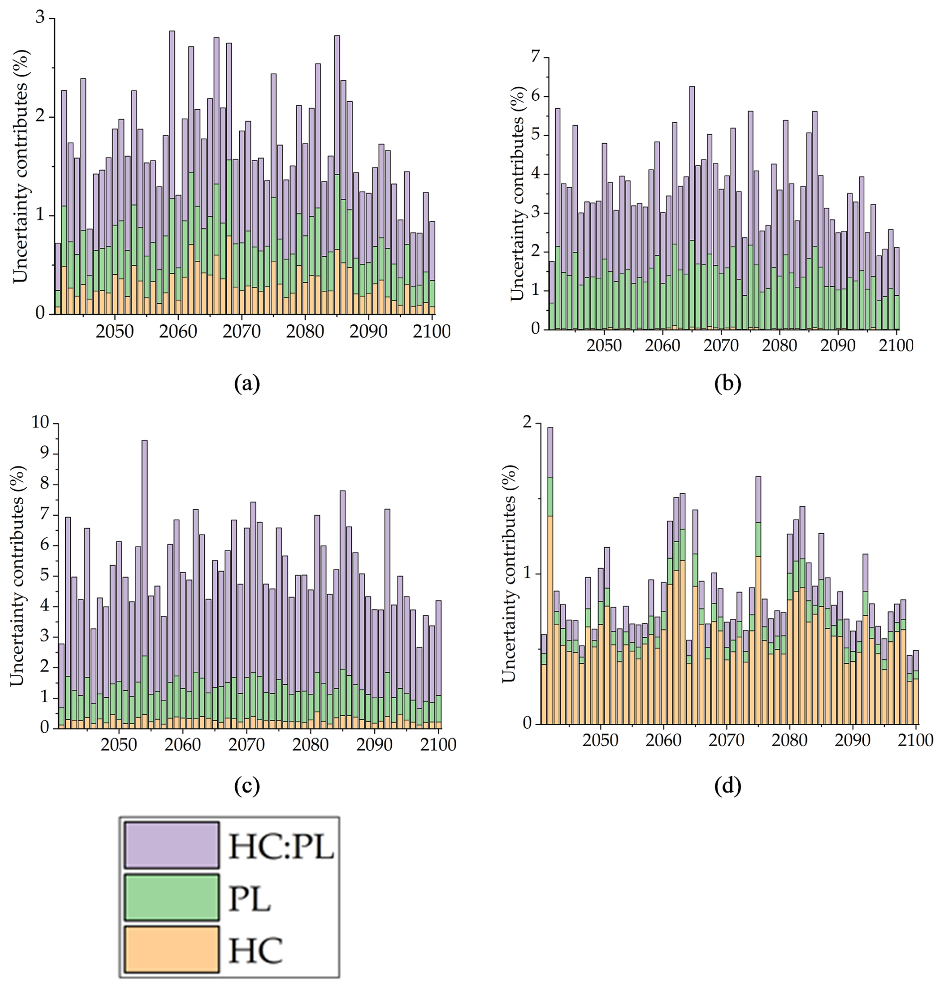 The hydrological model calibration factors, HC and PL, also proved to be important sources of uncertainty. Both factors were statistically significant across all four basins for the entire future period. This finding reinforces that the hydrological conditions and data length used for model calibration have a persistent and significant influence on long-term hydrological drought assessments.