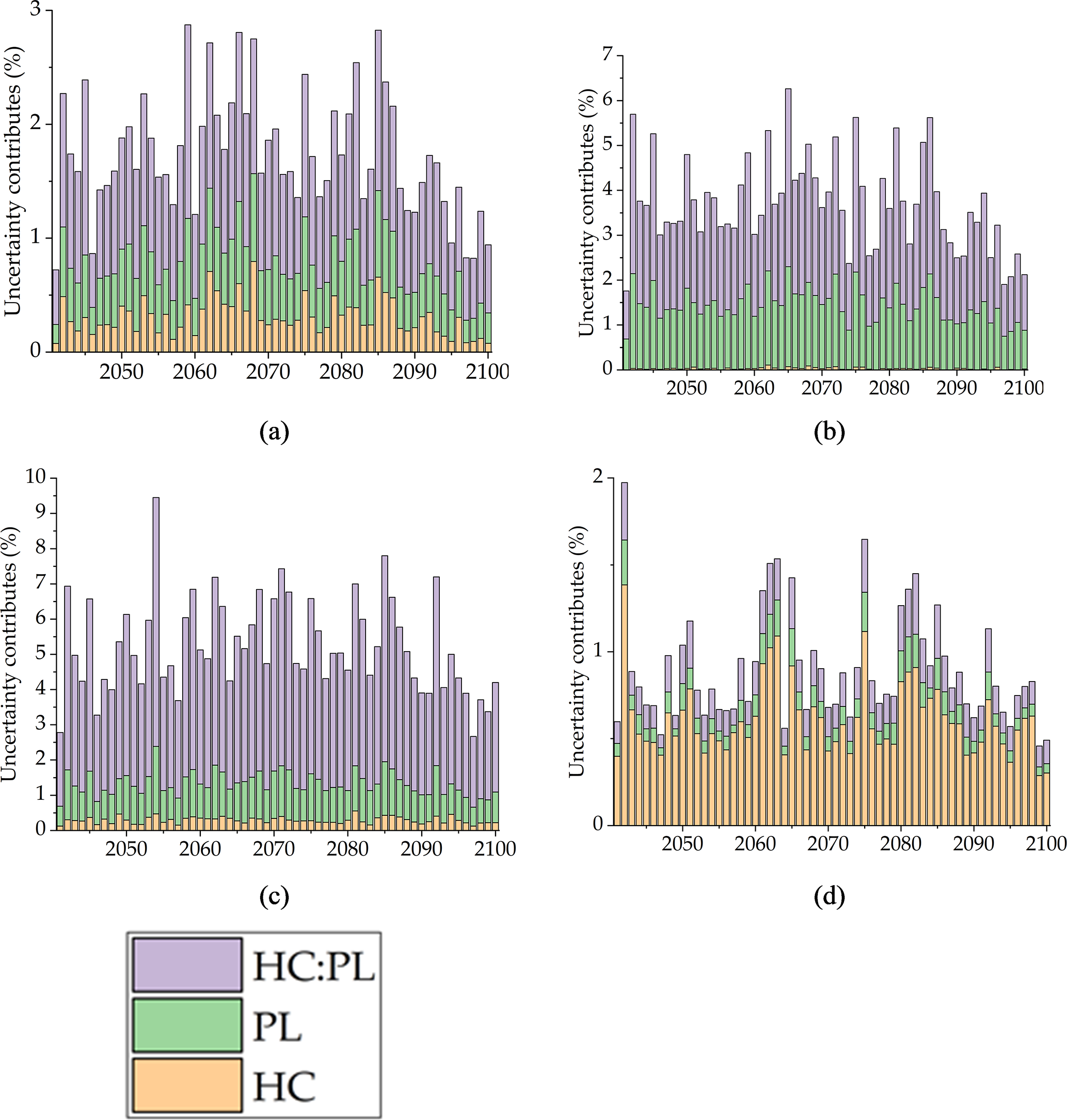 Figure 8Contribution of hydrological model parameters to the total uncertainty in the future 3 month SDI. (a) is AD, (b) is CJ, (c) is HCH, and (d) is SJ.