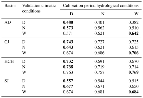 The performance analyses based on the hydrological conditions of the calibration and validation periods are shown in Fig. S3 in the Supplement and Table 1. Figure S3 shows the KGE values and the confidence level (prediction) for each hydrological condition during the validation period according to the SDI values. Overall, during the dry and normal validation periods, it was analyzed that lower SDI values (dry condition) correlated with higher KGE values. This indicates that SWAT parameters calibrated with dry validation period data effectively simulate runoff under Dry and Normal hydrological conditions. For wet validation periods, higher SDI values (wet condition) correlate with higher KGE values, indicating that SWAT parameters calibrated with wet calibration period data accurately simulate runoff under wet conditions.