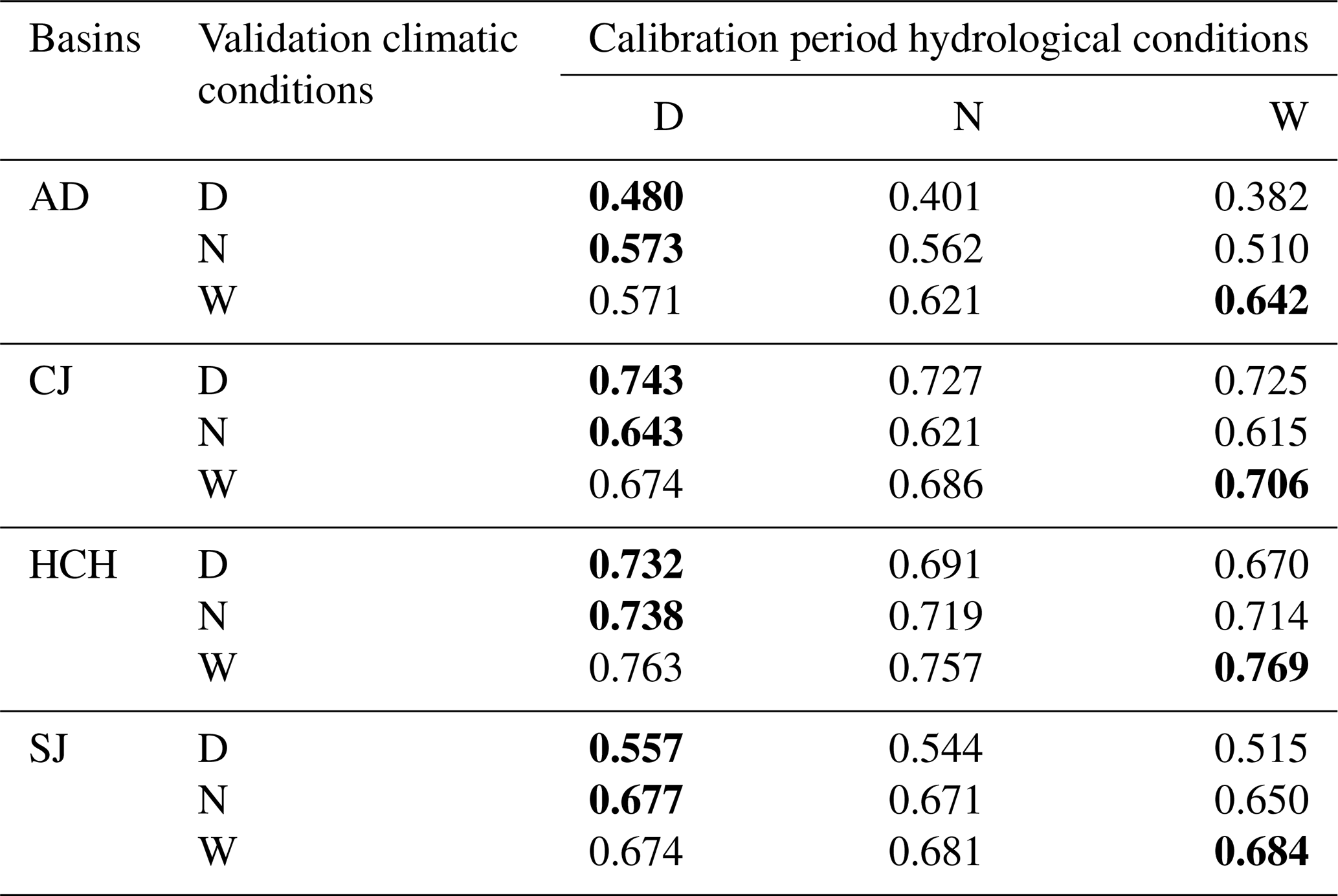 As shown in Table 1, the average KGE according to hydrological conditions is as follows. The KGE values for each dam basin, according to the hydrological conditions of the calibration-validation periods, are as follows: For AD, D-D (Dry-Dry; hydrological conditions for calibration and validation periods, respectively) was 0.480, higher than W-D (Wet-Dry) of 0.382; D-N (Dry-Normal) was 0.573, higher than W-N (Wet-Normal) of 0.510; and W-W (Wet-Wet) was 0.642, higher than D-W (Dry-Wet) of 0.571. For CJ, D-D was 0.743, higher than W-D at 0.725; D-N was 0.643, higher than W-N at 0.615; and W-W was 0.706, higher than D-W at 0.674. For HCH, D-D was 0.732, higher than W-D at 0.670; D-N was 0.738, higher than W-N at 0.714; and W-W was 0.769, higher than N-W (Normal-Wet) at 0.757. Lastly, for SJ, D-D was 0.557, higher than W-D at 0.515; D-N was 0.677, higher than W-N at 0.650; and W-W was 0.684, higher than D-W at 0.674.