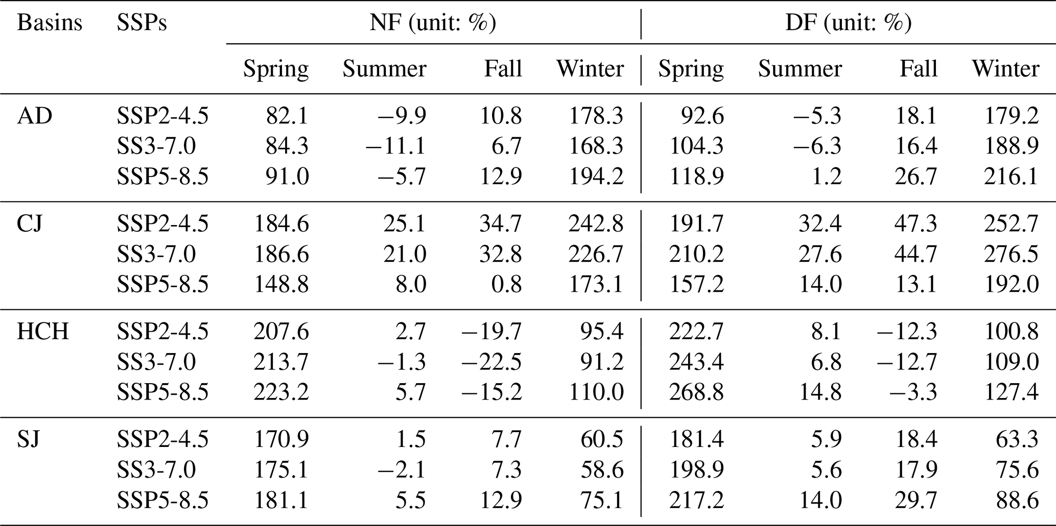 For AD, the future seasonal runoff is likely to increase in all seasons except summer. This increase would be more pronounced during DF than NF, with the largest increases occurring under SSP5-8.5. For CJ, the future runoff is expected to increase compared to the past in all seasons, with the highest increase observed in DF under SSP3-7.0 and the lowest increase under SSP5-8.5. For HCH, future runoff is expected to increase in all seasons except fall, with the greatest variability in fall under SSP3-7.0. For SJ, future runoff is projected to increase compared to the past in all scenarios except NF under SSP3-7.0.