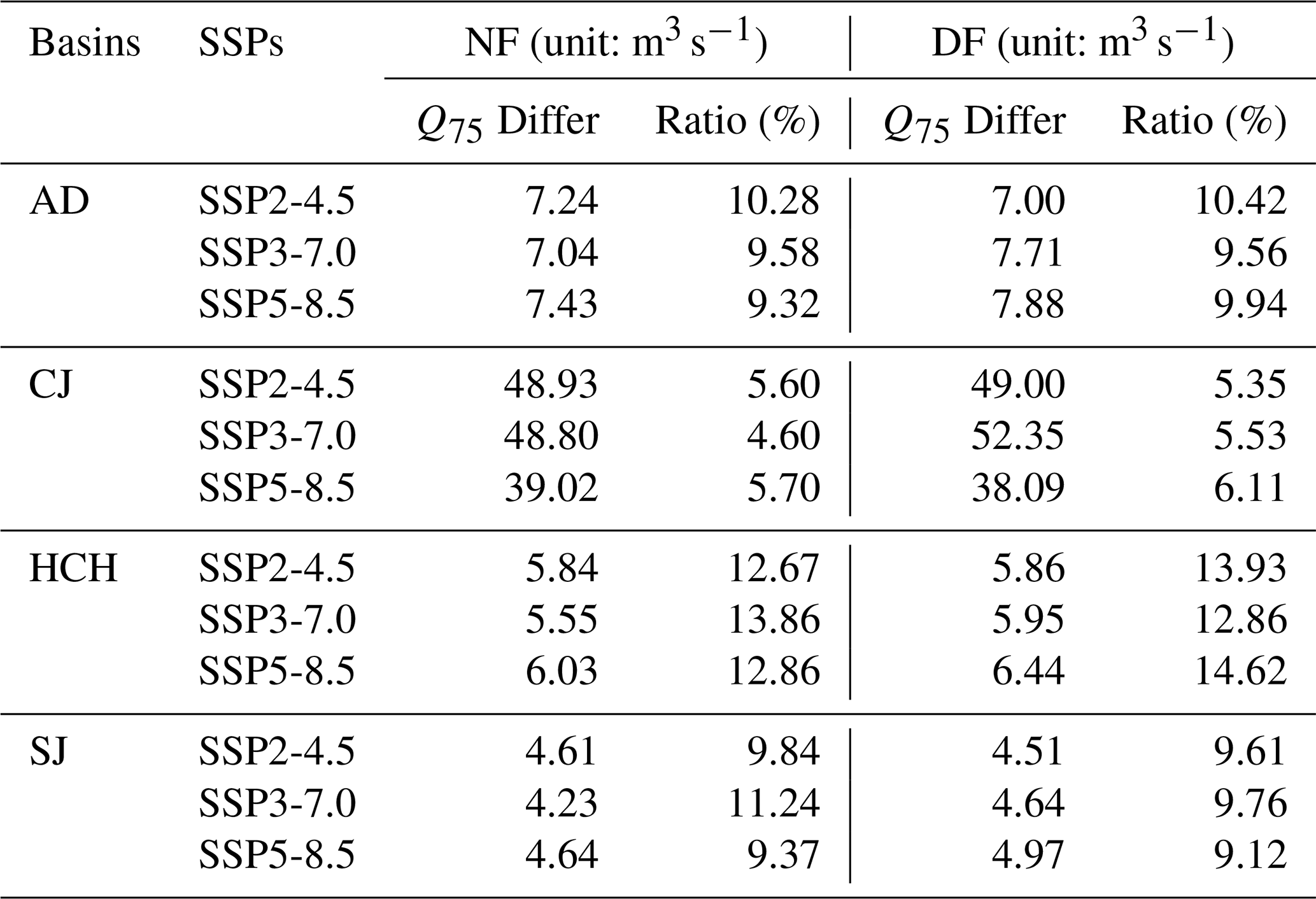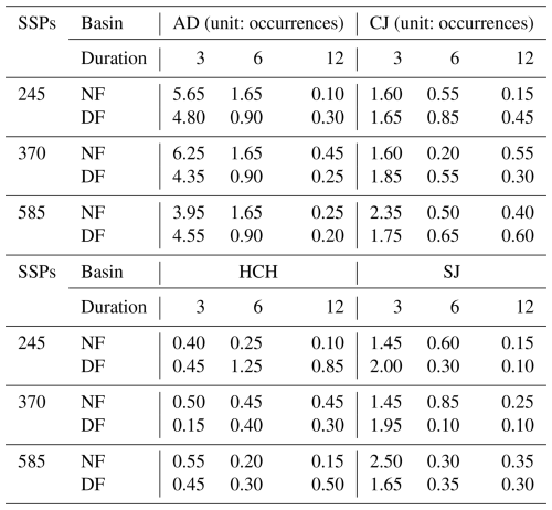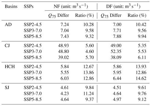 The future runoff was projected using climate data and hydrological model parameters as shown in Fig. S5 in the Supplement. Overall, future runoff is expected to increase relative to the historical data, with more significant increases projected during DF than NF As the SSPs change (e.g. from SSP2-4.5 and SSP3-7.0 to SSP5-8.5), not all annual runoff show a consistent increase with the scenario change, as shown in Table 2. In particular, the increase in annual runoff under SSP5-8.5 was not always higher than SSP2-4.5 or SSP3-7.0. These differences were analyzed to vary significantly between different basins and GCMs.