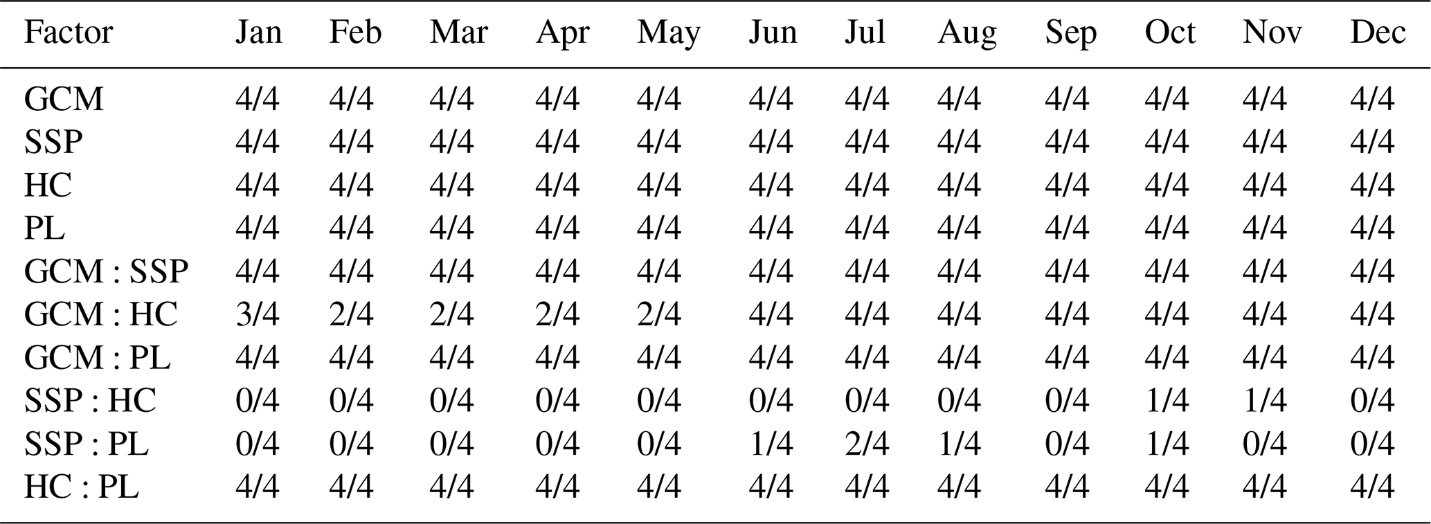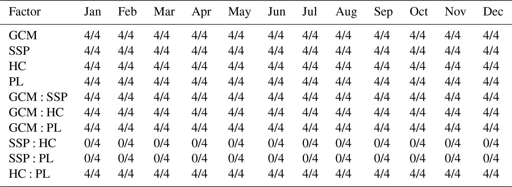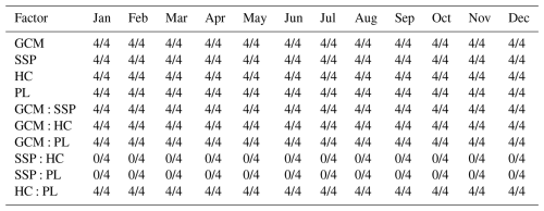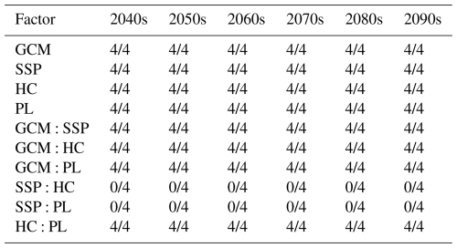 The factors related to the hydrological model calibration, HC and PL, were also found to be statistically significant for the future runoff projections. Tables 4 and 5 summarizes the frequency of statistical significance (p< 0.05) for each factor across the four study basins. The values indicate the number of basins out of four where the factor was found to be significant. Although their influence was smaller than that of GCMs and SSPs, both HC and PL were significant (p< 0.05) in numerous months, particularly during the low-flow periods such as spring and winter. This result highlights that the calibration conditions should be considered an important source of uncertainty.