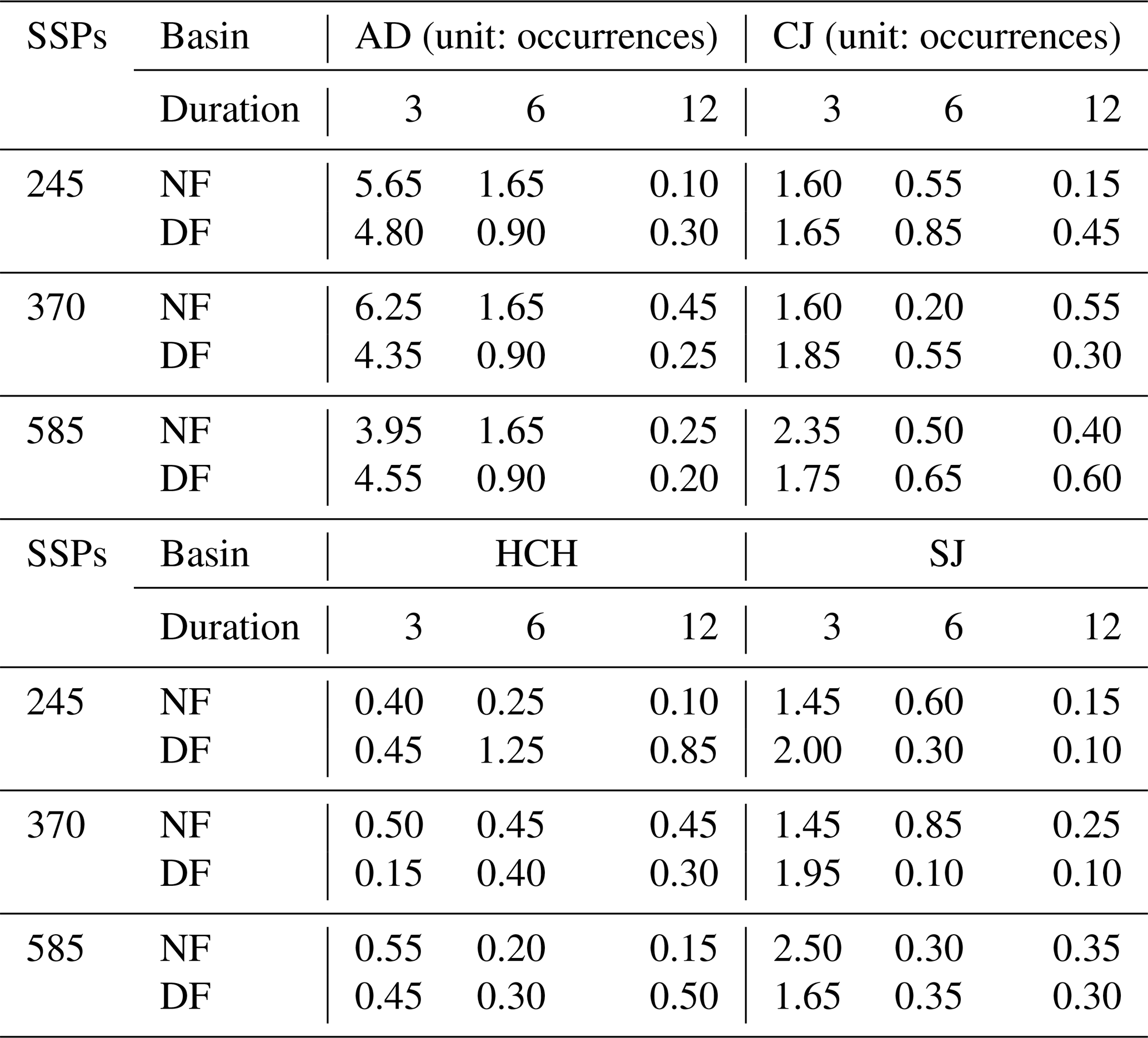 According to the analysis by basin, the difference in the number of drought events in the AD basin with a 3 month duration was calculated to be the largest, with an average of 4.93 events, followed by SJ, CJ, and HCH. Between the near future (NF) and distant future (DF), the difference in the number of drought events under the overall hydrological conditions was larger in the NF, and this difference was calculated differently by basin, confirming the need for basin-specific analysis in water resource management planning. Therefore, the uncertainty quantification of the drought analysis was performed using the SDI with a duration of 3 months.