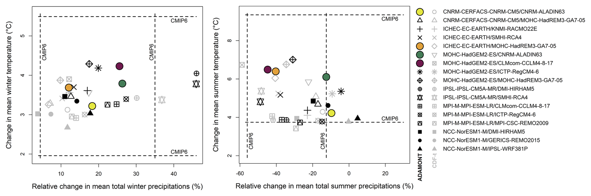 Figure 1Changes in seasonal precipitation and temperature (winter and summer) between the reference period 1976–2005 and the end of the century 2070–2099 under RCP8.5. Dots in grey are related to projections obtained with the CDF-t bias correction method while dots in black are related to those obtained with the other bias correction method ADAMONT. Dotted lines define the range of values consistent with projected changes in CMIP6 (calculations were made in 2022).