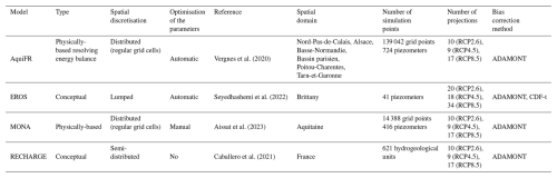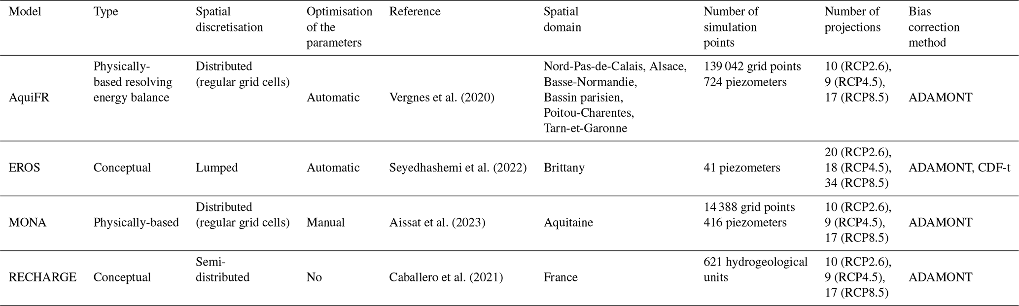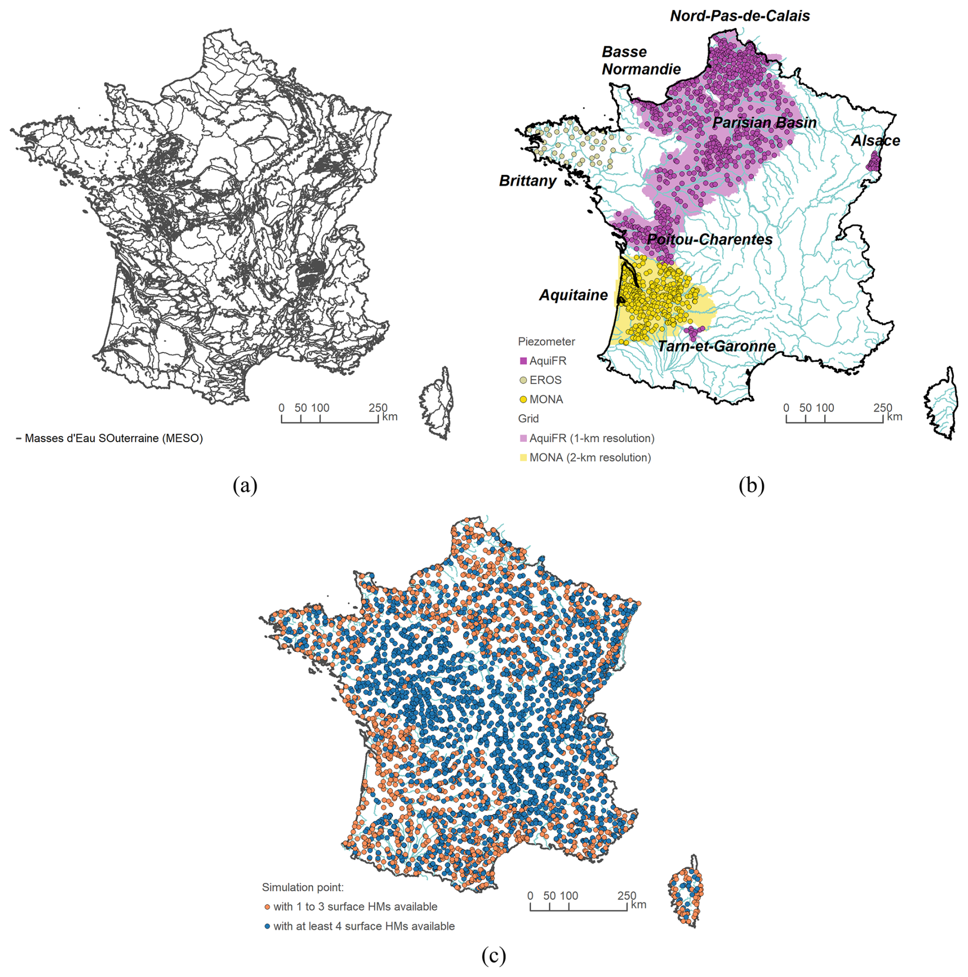 The potential recharge of groundwater by precipitation is estimated at the regional scale. The pre-existing division of France into 621 groundwater bodies (Masses d'Eau SOuterraine, MESO, Fig. 2a) delineated so as to be homogeneous in terms of hydrogeological characteristics (Mardhel and Normand, 2006) has been adopted here. As part of the previous Explore2070 project, groundwater simulations were provided for a group of separated but major aquifers with sedimentary formations (excluding karst), which are also the most heavily exploited. The domain simulated by the groundwater HMs (Fig. 2b) was extended in the Explore2 project to cover a large portion of north-western mainland France. Groundwater levels are provided on a 1 km resolution regular grid for the AquiFR modelling platform (∼ 140 000 points), and on a 2 km resolution regular grid for MONA (∼ 10 000 points). In addition to gridded outputs, simulations are provided on a set of piezometers (∼ 1100 points), available in the national database ADES (https://ades.eaufrance.fr/, last access: 1 April 2026).