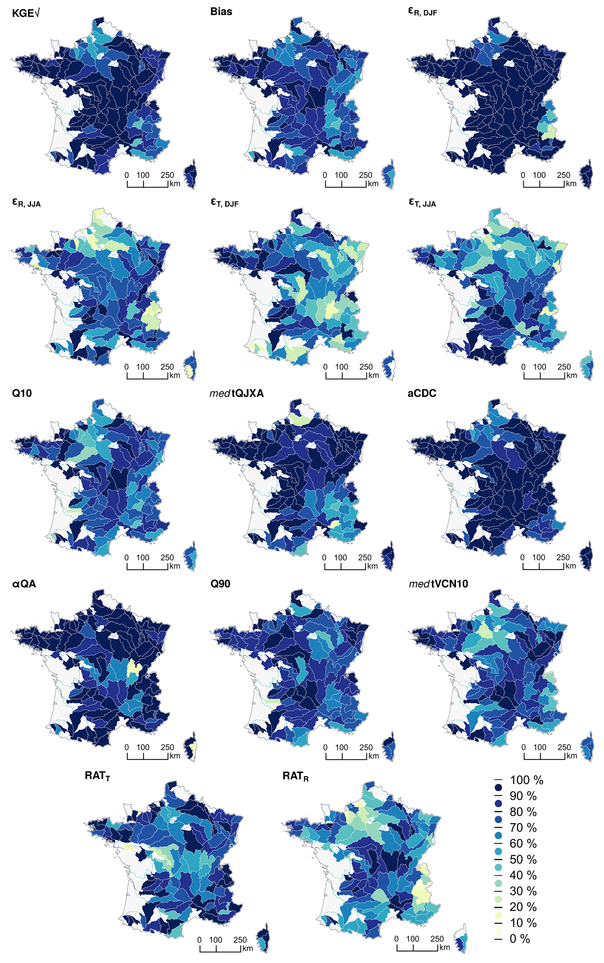 The proportion of values within the acceptable range for all models and all stations is displayed in Fig. 3 for the 14 evaluation scores. Less satisfactory results in terms of KGE√ are found in the north of France, the downstream tributaries of the Seine River basin, and the South-East. These poor results are primarily due to unsatisfactory modelling of surface-groundwater exchanges for these areas. Surface HMs encounter difficulties for groundwater-dominated catchments located in the North, and are challenged by extended karst systems in the South-East. In the Alps, the low values of KGE√ could be due to difficulties in modelling snow dynamics and biases in the SAFRAN forcings, i.e. an underestimation of total precipitation at high altitude (Magand et al., 2018). Care must also be taken not to over-interpret KGE√ scores on rivers influenced by groundwater, as this score is largely driven by the variability of streamflow, which is limited for these rivers. The map derived from the Bias score shows that the lowest performing catchments are located to the south-east and north, while the highest performance is found in the west. The analysis of the elasticities ϵ shows that the response to rainfall pulses in winter (εR, DJF) is well captured by the models and the spatial pattern is mainly explained by the absence/presence of large groundwater aquifers in lowlands and the contribution of snow to the total precipitation in mountainous areas. The spatial patterns obtained with εR, DJF and εR, JJA are quite similar but with more values out of the acceptable range in summer. We may suspect a difficulty in reacting well to local precipitation not well captured by the reanalysis SAFRAN. In a way, results with εR were expected: the models were designed to reproduce the rainfall-flow transformation, more particularly where liquid precipitation is the main driver. There is good sensitivity (εT, JJA) to air temperature in summer, especially in the south of France where evapotranspiration is the main driver of flow variability. Results for εT, DJF is diverse probably due to a weak sensitivity of river flow to fluctuation in air temperature in winter. The average seasonality of floods (medtQJXA) is correctly reproduced over France except for southern France. One possible reason is the bimodality of flood seasonality in these areas (see e.g. Fig. 3 in Blöschl et al., 2017) which calls into question the relevance of computing an average Julian date of floods. Performance scores on mean flows are fairly good across most of France. The hydrological models are globally able to reproduce current seasonal contrasts (aCDC) and long-term trends on annual flows (αQA). The most important biases on aCDC are identified in south-eastern and northern France, similar to what was found on the two overall scores KGE√ and Bias. The RAT metrics are very demanding, with a high failure rate, whether the models are calibrated through optimization or not. Performance in low flows is less satisfactory than in high flows when comparing Q90 and Q10 values. The acceptable range of variation for Q90 has been chosen wider than for Q10 (Table 3), so that the map associated with Q90 does not lead to widespread failure.