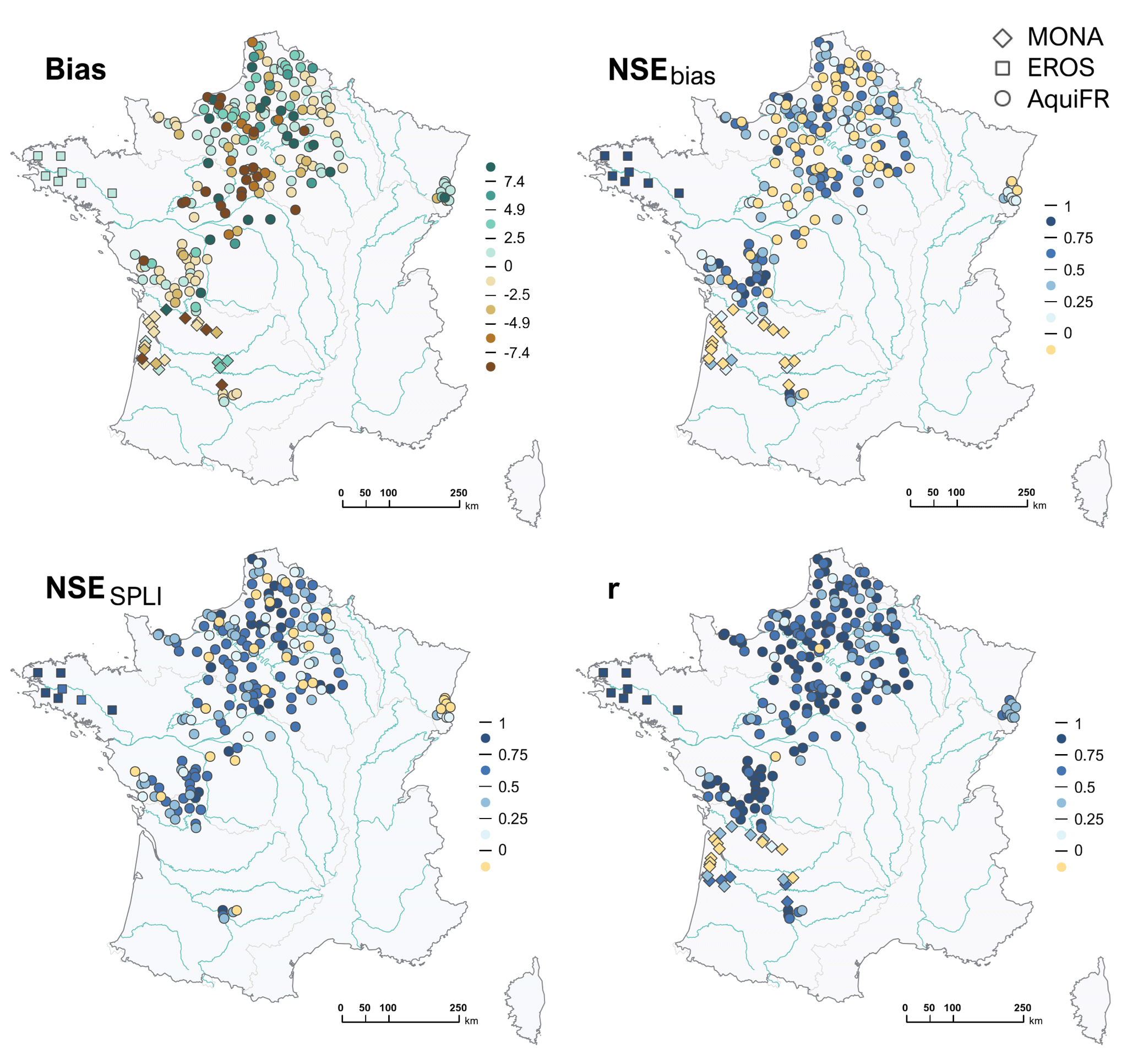 Evaluation of the hydrological projections over the reference period is a prerequisite before studying the impact of climate change on water resources, i.e. in conditions where all HMs are applied in extrapolation (Thirel et al., 2015). The evaluation process was conducted in two phases. First, Explore2 HMs have been evaluated over the period 1976–2019 by comparing simulations forced by the reanalysis SAFRAN with the observations at the reference points from the networks described above. Note that the evaluation of RECHARGE is extensively detailed in Robelin et al. (2026). Second, the entire modelling chain from GCMs to HMs was examined to assess how well the HMs forced by historical runs (i.e. bias-corrected projections for the reference period 1976–2005) can reproduce the various facets of the hydrological regime. Here, the focus is on surface hydrological models.